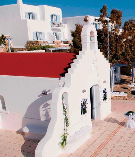 Saint John has been hosting weddings, corporate events and exhibitions (which all Petinos’ properties o er venues for) since its opening and was quickly revered for its e cient, all-encompassing events planning team that includes wedding coordinators, in-house catering, beauty center and oral specialist. Another quick-to-sell detail is the private chapel, Agia Fotini, that’s in style with the island’s traditional, cubic architecture.