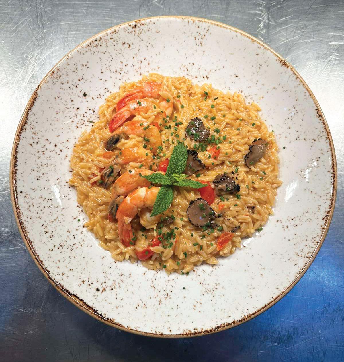 With a laid-back atmosphere and ideally set next to the picturesque Platis Gialos beach, Blue Myth provides the perfect setting for a casual lunch with friends and family or an intimate candlelit dinner with your soulmate. e restaurant serves unpretentious healthy dishes that blend the traditional with the new. And don’t miss the opportunity to experience an authentic Greek glendi, or feast, with dancing and singing entertainment on Wednesday and Sunday nights.
