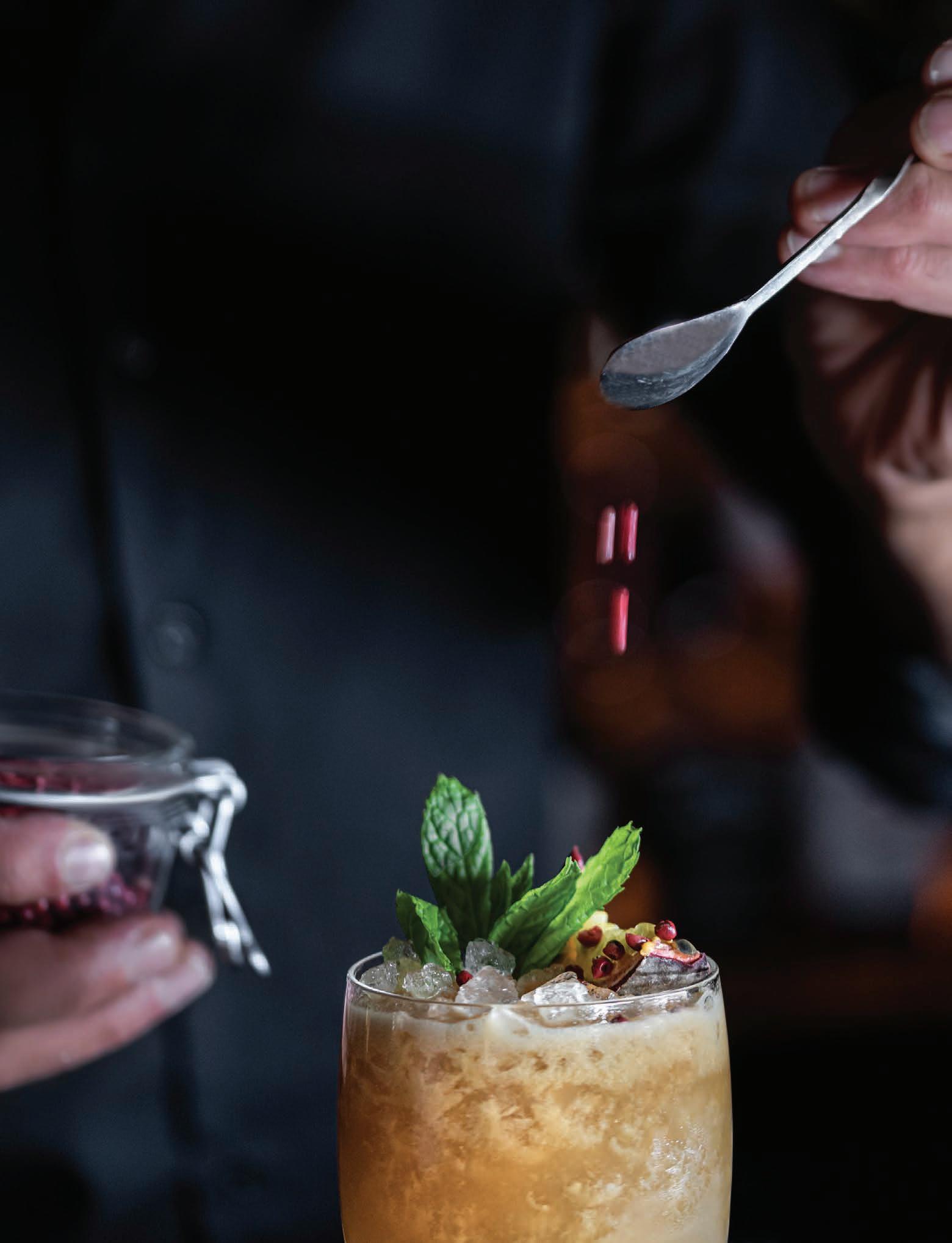 Decadence comes to life through the Blood Goose, which gets a rich red color from the blackberry puree, but layers an additional dimension with green apple and hibiscus. The drink is reminiscent of true tropical times as served in a hurricane glass with a long straw. It’s a great way to ease into the night or kick things up a level.