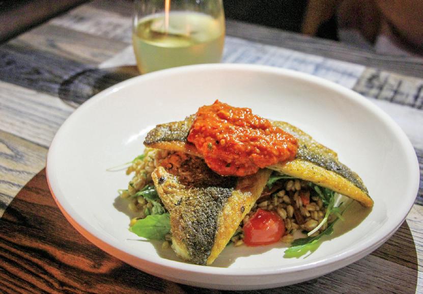 Other starters include rosemary fries with garlic oil, barbecue chicken pizza topped with fried chicken, oysters accompanied by a mignonette made with hibiscus sabdariffa (often used to brew a tea), plus a charcuterie board with cured meats, cheeses, dried fruits, herb-roasted nuts and garlic crostini. When it comes to main entrees, the pan-seared pub steak—sometimes subbed for New York steak on special occasions—is drizzled with chimichurri sauce, peppery parsley and tangy red wine vinegar blending to pack the dish full of flavor. Cooked with butter, thyme, garlic and shallots, the slices of meat are layered atop crisp fingerling potatoes and charred broccolini. And for a sipping wine that enhances the taste of the herbs and meat, try the Jean Chartron