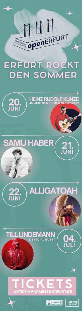 Einzelvertrieb: Erfurt Tourismus und Marketing GmbH, Benediktsplatz 1, Tel. (0361) 66 40–0, Bezugspreis jährlich: 19,80 Euro incl. 7 % MwSt. Abonnieren unter www.erfurt-magazin.info