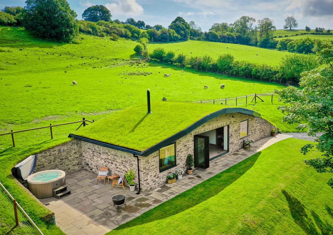 A unique holiday home, seamlessly immersed in the green hilly landscape, is located on a remote estate in the rural beauty of Wales. The house with a sod roof is literally built into a hill and surrounded by green fields. The modern and cozy interior, combined with the surrounding greenery, peace, and quiet will delight fans of nature, animals, and the idyllic countryside. Seeing a badger, fox, deer, or otter there is a daily occurrence, especially for those who take a walk to the nearby lake.