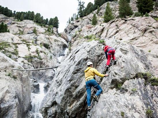 Along the cascades of the Rifflerbach waterfall, the Holderi-Seppl via ferrata extends above the Fernergries high valley. Surrounded by stone pine trees and close to the roaring stream, we’ll explore this mountain landscape once covered by glacial ice.