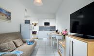 Appartamento per 4 persone con camera matrimoniale, una cameretta con letto a castello, 1 bagno, soggiorno con cucina a vista e zona pranzo.