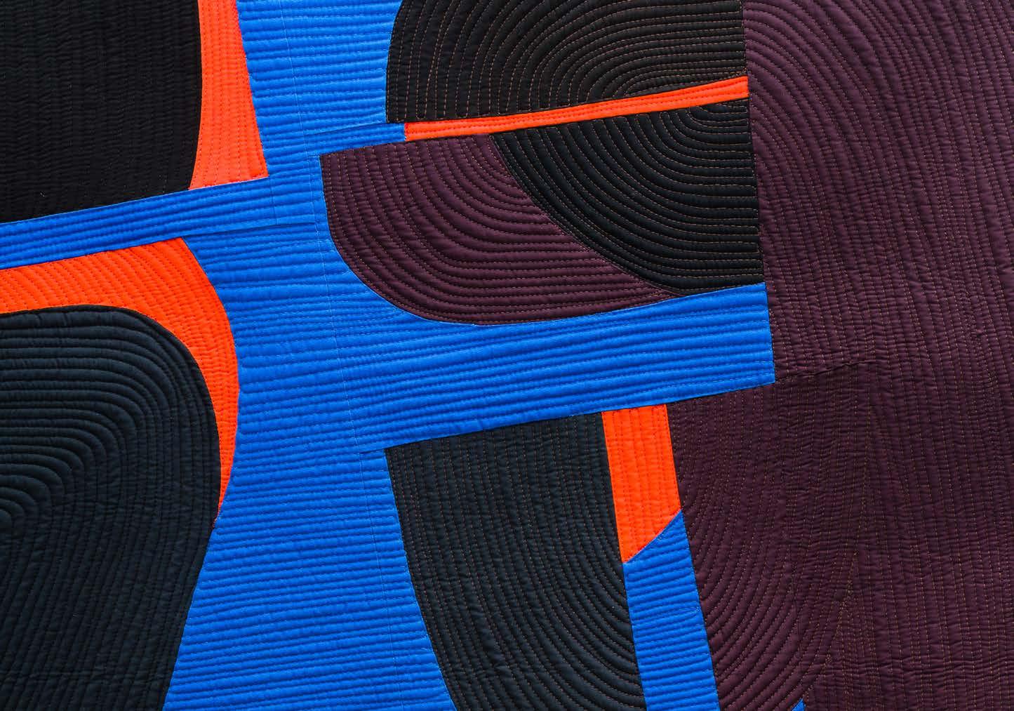 Spilka’s works bypass the purely domestic nature of typical quilting most remarkably for their color, scale, and movement. With some as large as 95 inches, her works often have the presence of murals, or a modernist idea of a grand tapestry. Admittedly she favors large scale for the opportunity to place the viewer viscerally in the work. It is at this scale that you are best able to perceive the subtle movements created by the intricate, rhythmic stitching that travels along each form. While formally a structural component holding the layers together, the quilting stitches also establish subtle dimension and texture that can be transformed with the use of contrasting thread colors or directional shifts. Spilka hand dyes her fabrics in an antique ringer washer giving her complete control of her palette, which is confident and refined, and often restrained. With only a few colors tasked with carrying the image, often one will give a vibrating jolt cutting through the harmony of the others.