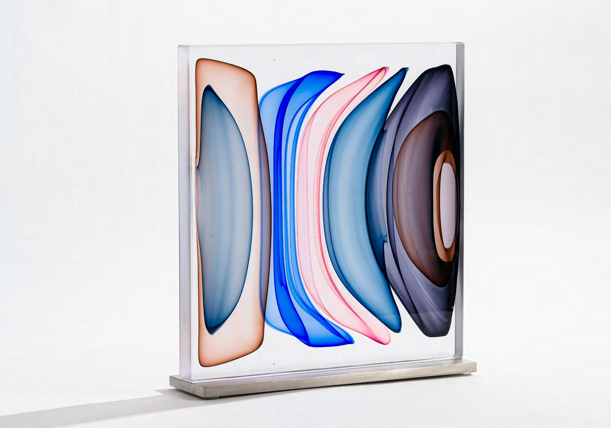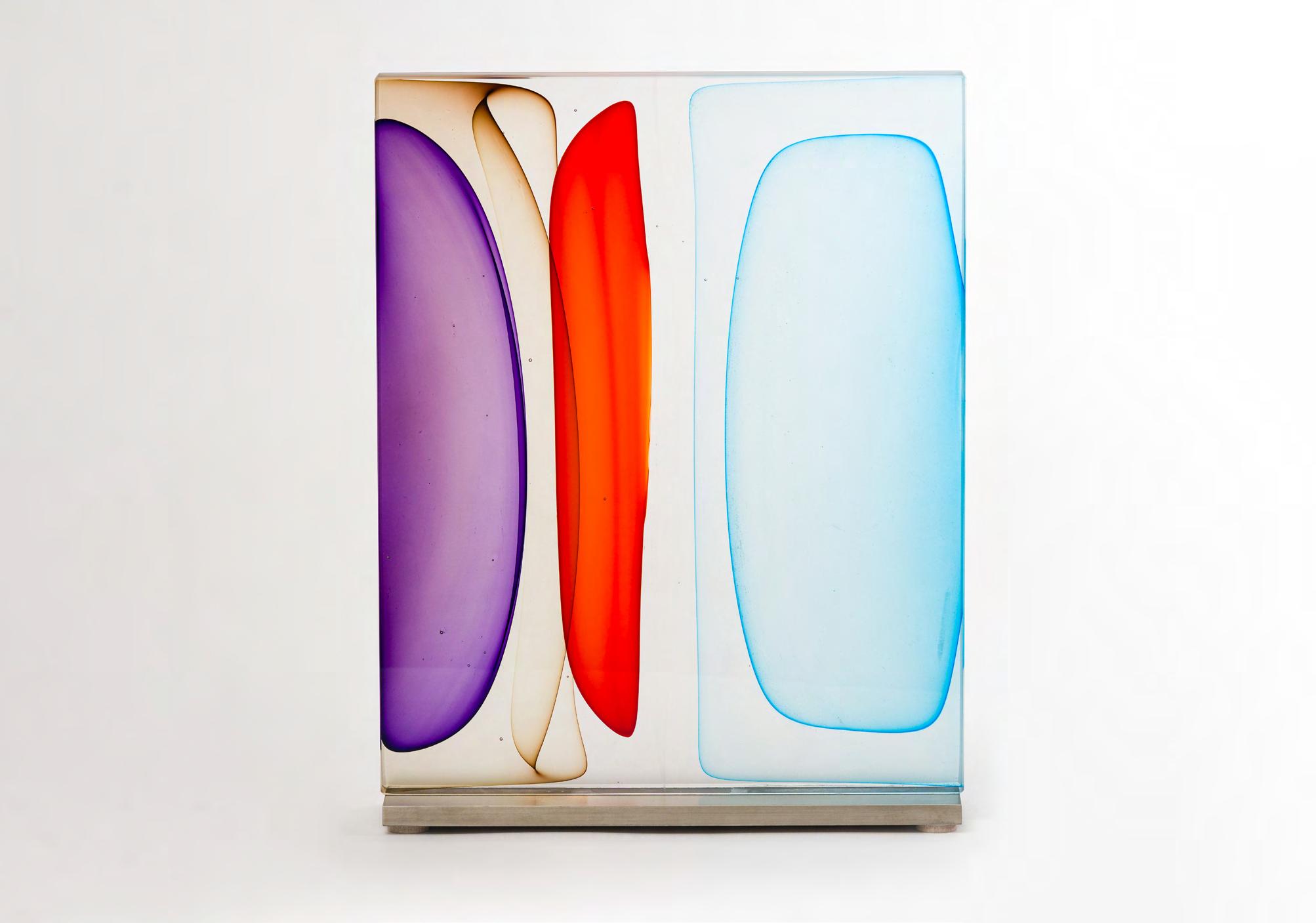 Jamie Harris’ spellbinding glass sculptures, which he calls Infusion Blocks, boast a dynamic quality rooted in his ability to capture the alchemy and activity of the glass making process into a static, impenetrable three-dimensional image. Superficially the works present themselves as rich color-field paintings. Vibrant, cascading color combinations expand and contract upon each other, jockeying for space as they are pushed to the picture’s edge. Challenging the inflexible opacity of painting, the innate ability of glass to transmit, reflect, and absorb light creates an ever-changing abstract picture, one that is in a constant dialogue with the surrounding environment.