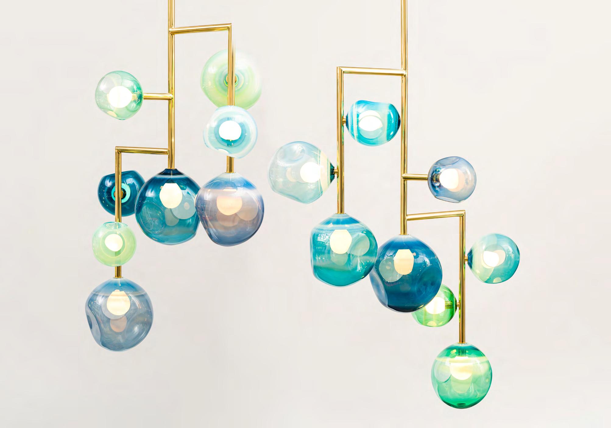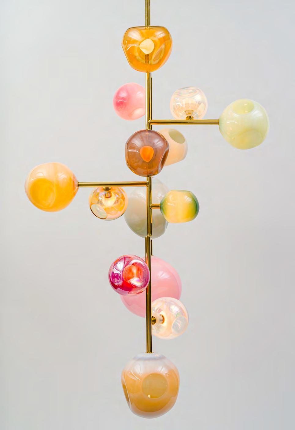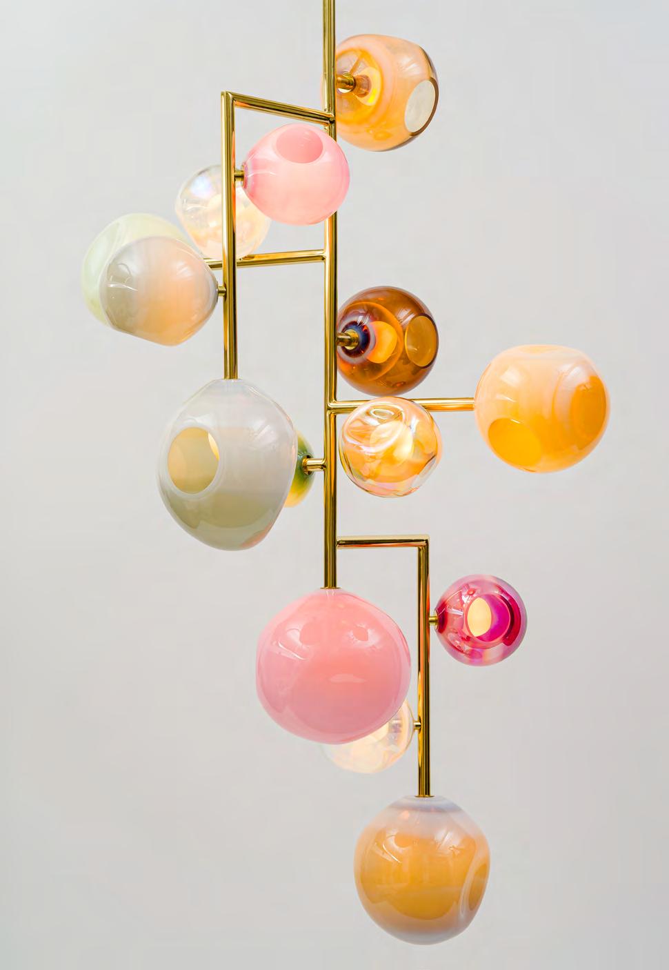Today in addition to his fine art glass sculptures, Harris creates unique, hand-made sculptural lighting. Drawing on the contrast between rigid, geometric metal structures and organic, hand-made glass forms, his pendants, sconces, and chandeliers achieve a balanced universality. By altering the opacity, employing metallic finishes, or creating opalescent and iridescent surfaces, the works can sit at either ends of the spectrum from minimal to extravagant.