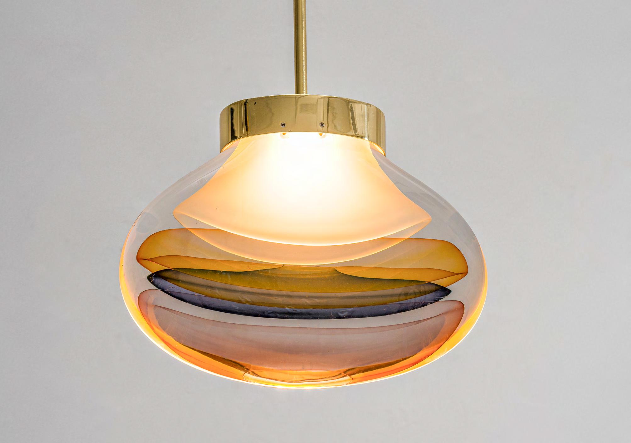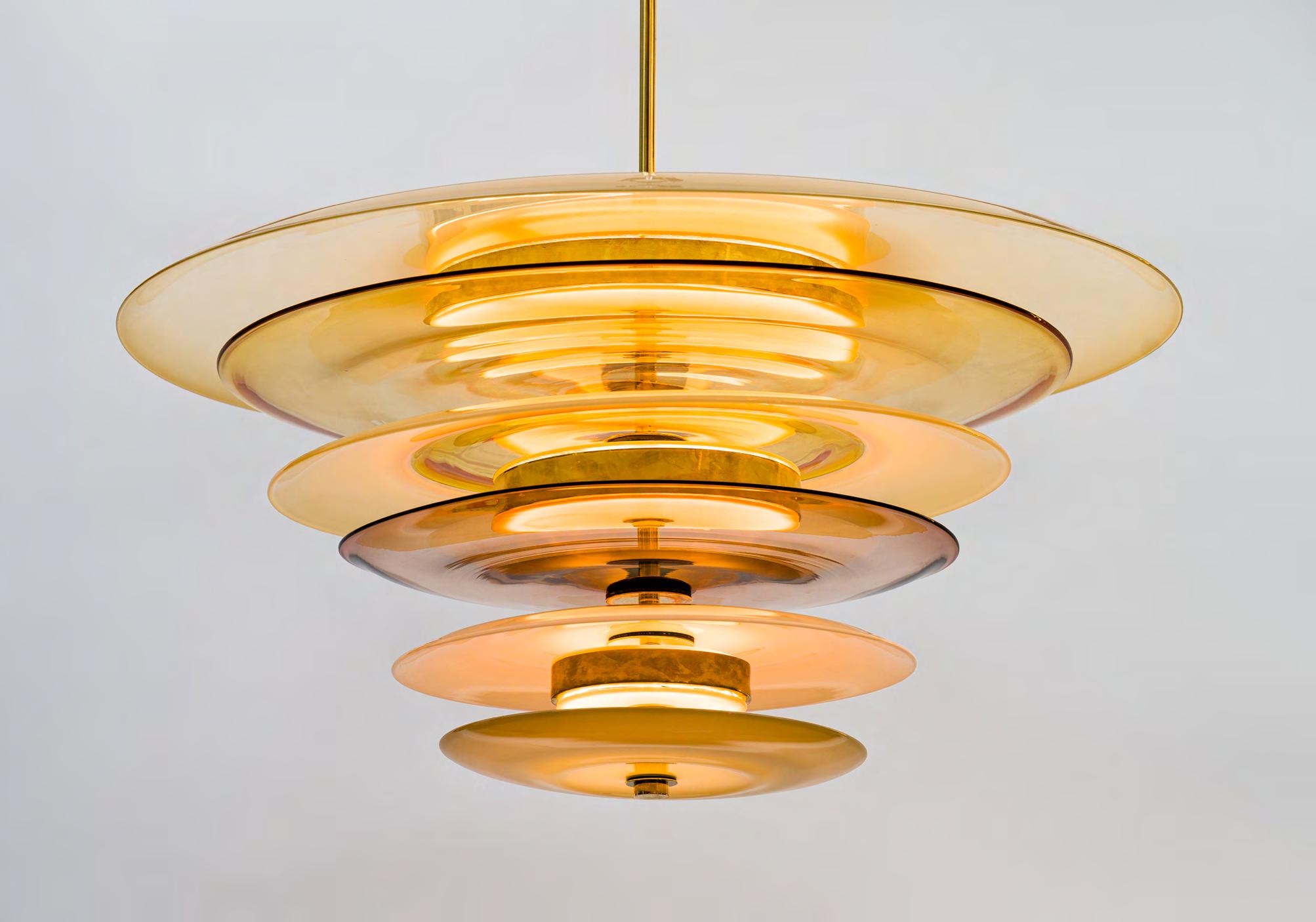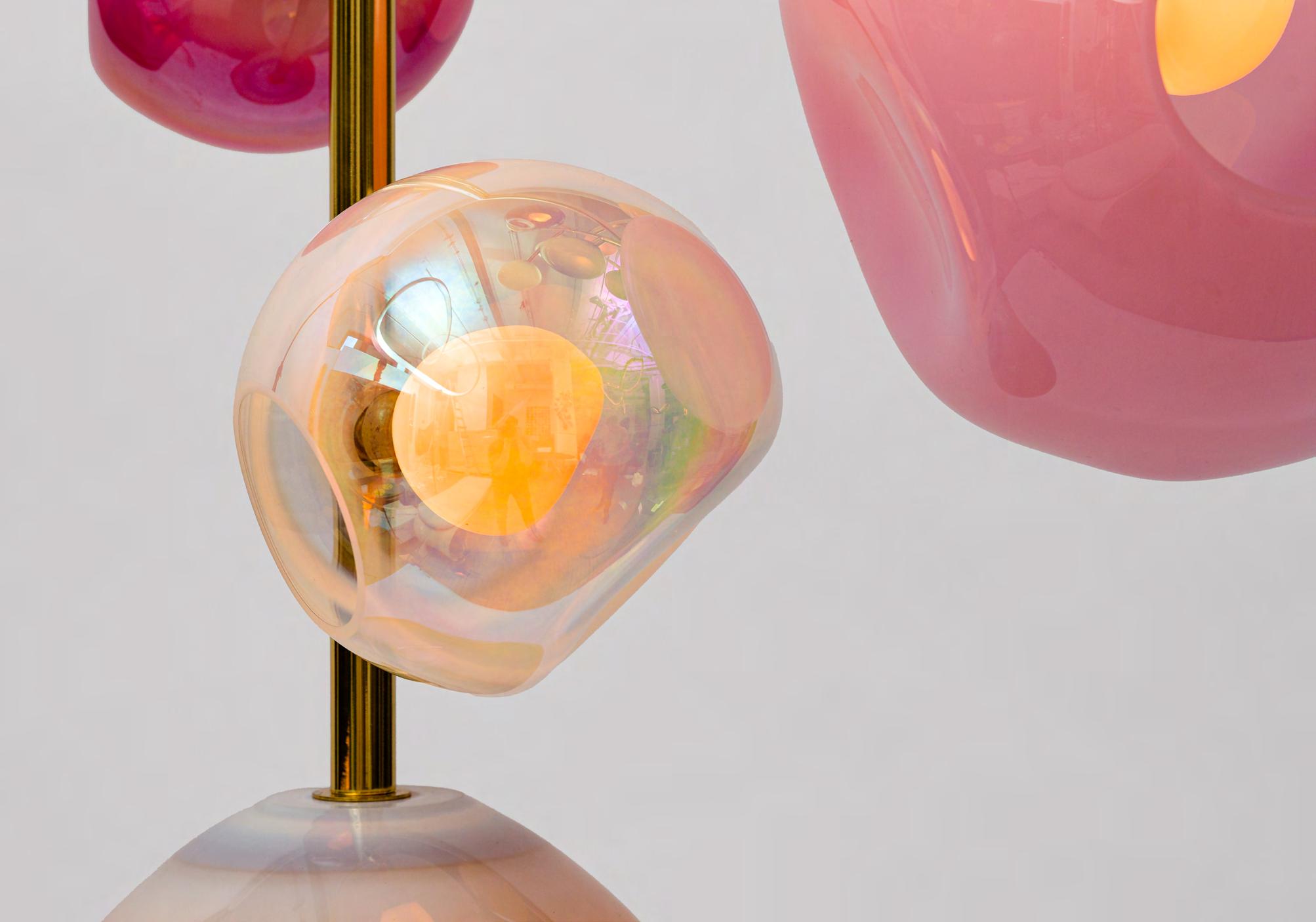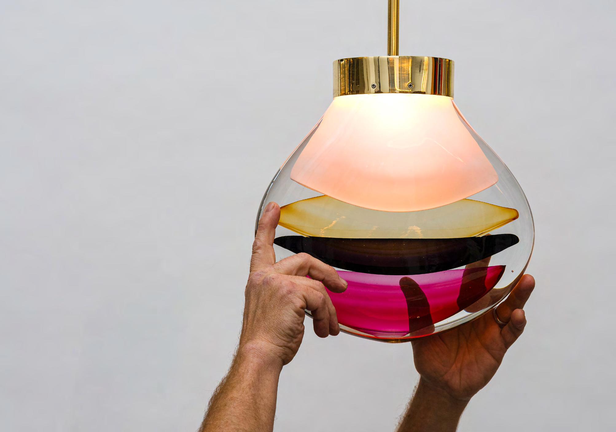 Today in addition to his fine art glass sculptures, Harris creates unique, hand-made sculptural lighting. Drawing on the contrast between rigid, geometric metal structures and organic, hand-made glass forms, his pendants, sconces, and chandeliers achieve a balanced universality. By altering the opacity, employing metallic finishes, or creating opalescent and iridescent surfaces, the works can sit at either ends of the spectrum from minimal to extravagant.