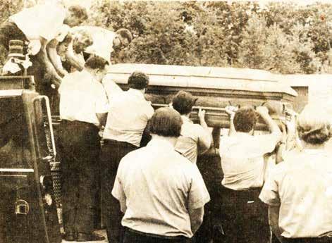 Firefighters wearing black tape on their badges served as pallbearers, helping load and unload the caskets onto fire trucks before and after the journey to New Oak Hill Cemetery, where the VFW gave a 21gun salute.