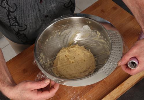 Première fermentation ou levée. La pâte légèrement farinée est mise au repos, dans un saladier, préalablement huilé à l’aide d’un papier absorbant, recouvert d’un torchon pendant 2 à 3 heures si la température ambiante est d’environ 25° C … plus il fait chaud et plus la pâte lève rapidement. La pâte doit avoir doublé de volume. Une fois levée, il faut dégazer la pâte en enfonçant énergiquement le poing dedans pour faire sortir les gaz, sans la travailler, puis la laisser reposer quelques minutes.