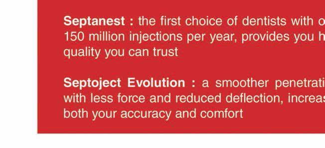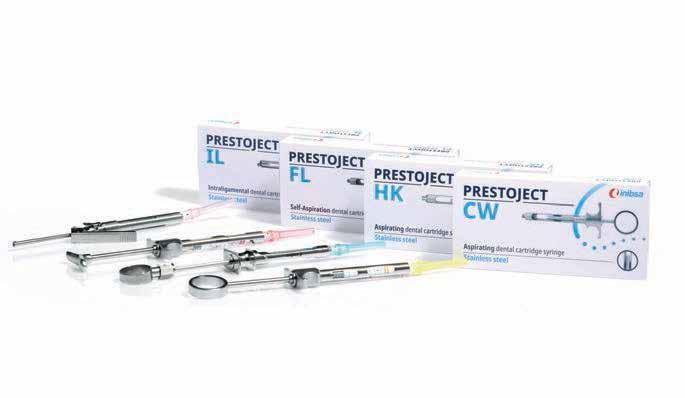 Prestoject® syringes are Inibsa’s newest launch and complete the Pain Control product portfolio. They combine durability, functionality and precision to provide accurate injections of local anaesthesia while minimising patient’s discomfort. This product line consists of 4 di erent syringes, which di er on the aspiration system and the administration technique they are specifically designed for.