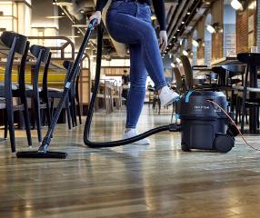 De nye, kompakte støvsugere på hjul, VP300 og VP400, er designet, så man nemt kan tænde og slukke maskinen med foden. Samtidig kommer VP400 med en praktisk ledningshåndtering, der ikke forringes over tiden, så brugeren slipper for slidte oprulningshjul.
