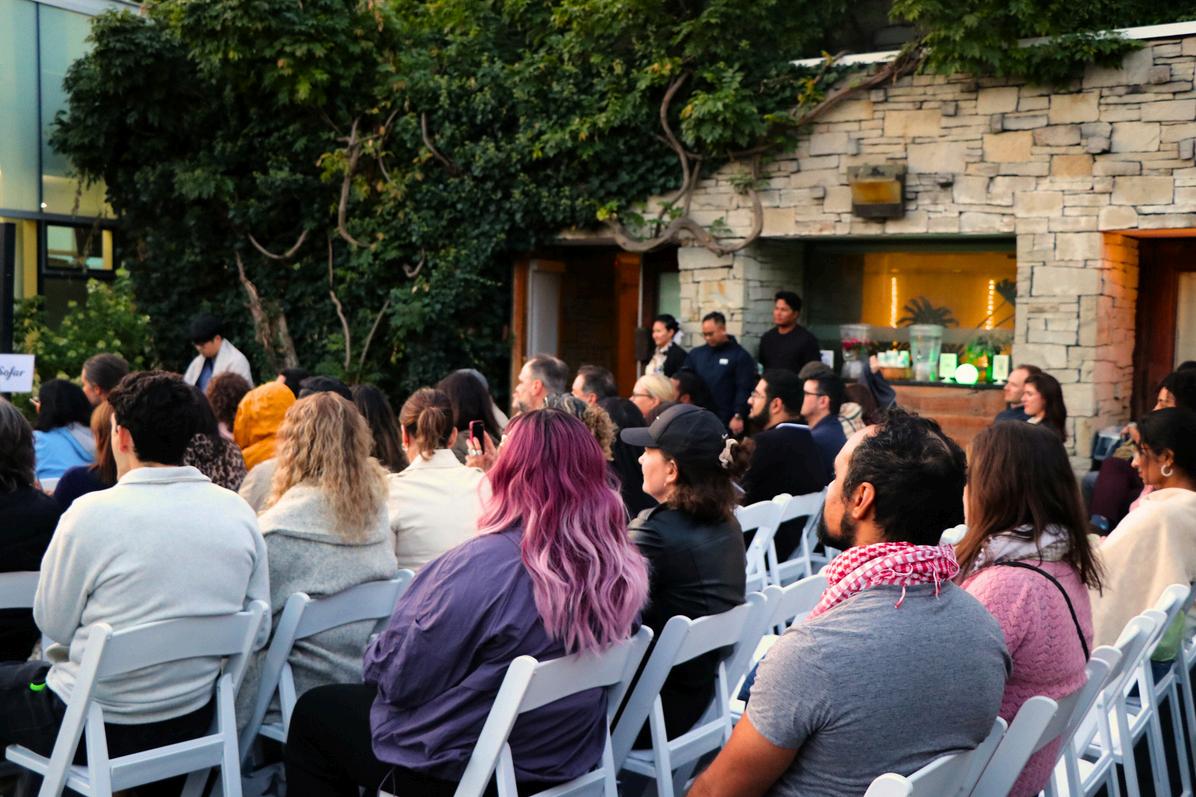This Terrace is a beautiful extension for outdoor gatherings that spill out from the Garden Hall It can be added to a Garden Hall rental. This additional space doubles the area of the Garden Hall Courtyard and gives two distinct gathering areas divided by a waterfall spilling into a curved water channel and surrounded by a lush perennial garden