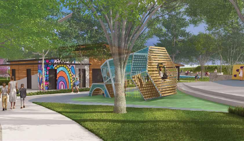 features such as a bouldering wall, climbable sculptures, a 7,000 square foot skateboard park geared toward all abilities, plus multi-sport courts that can be used for basketball, tennis, pickleball, and bocce ball. Other features focus on areas for socializing and relaxing, such as walking paths, a community hearth, a hammock grove, benches and tables, a multi-use covered pavilion for gathering and performances, as well as restrooms, and native plantings.