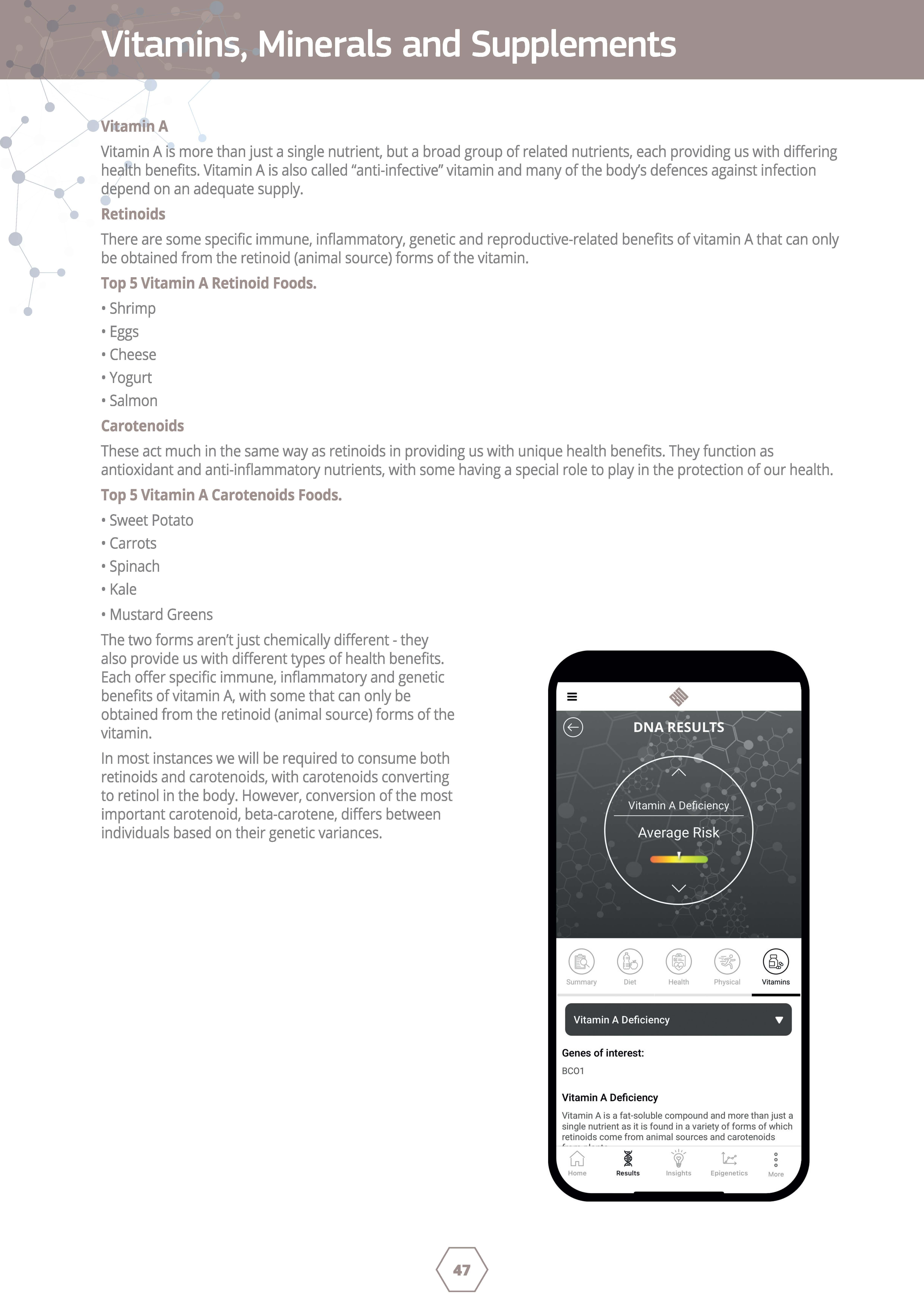 0 Summary Diet Health Phys cal Vitami ns VITAMINS OVERVIEW Vitamin D Deficiency Statu s: NO RMA L RISK Vitamin A Deficiency Statu s: AVERAGE RISK LJ I Home Res ult s i' IL:: Insights Epigenet cs More