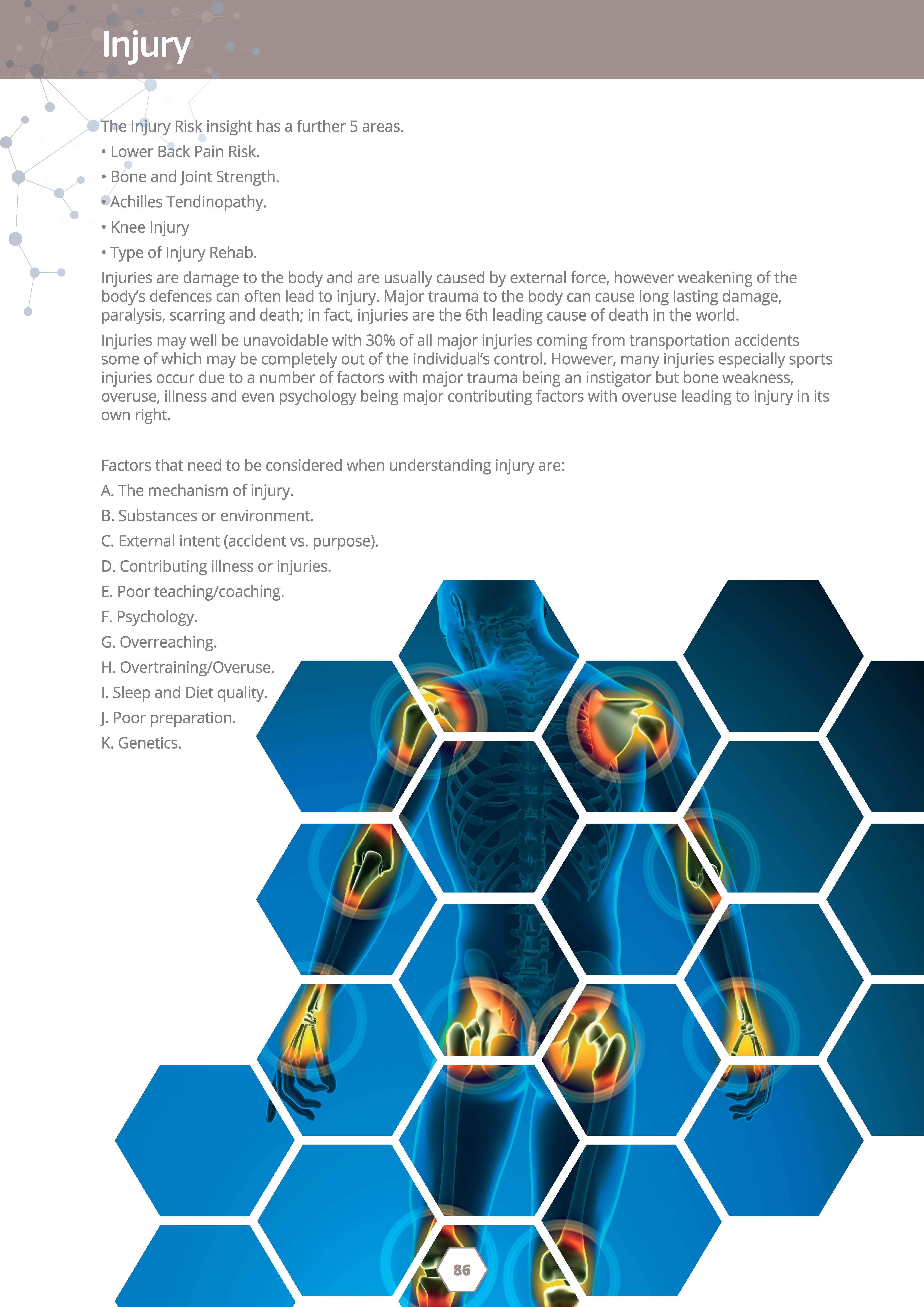 A note to remember is that you must always remember to look at your report in its entirety, as many areas will have a knock-on effect and can dramatically affect other areas. For example, having a slow recovery combined with higher risk of inflammation can increase your risk of being injured if you aren't fuelling your body correctly or getting sufficient rest between sets and between workouts.