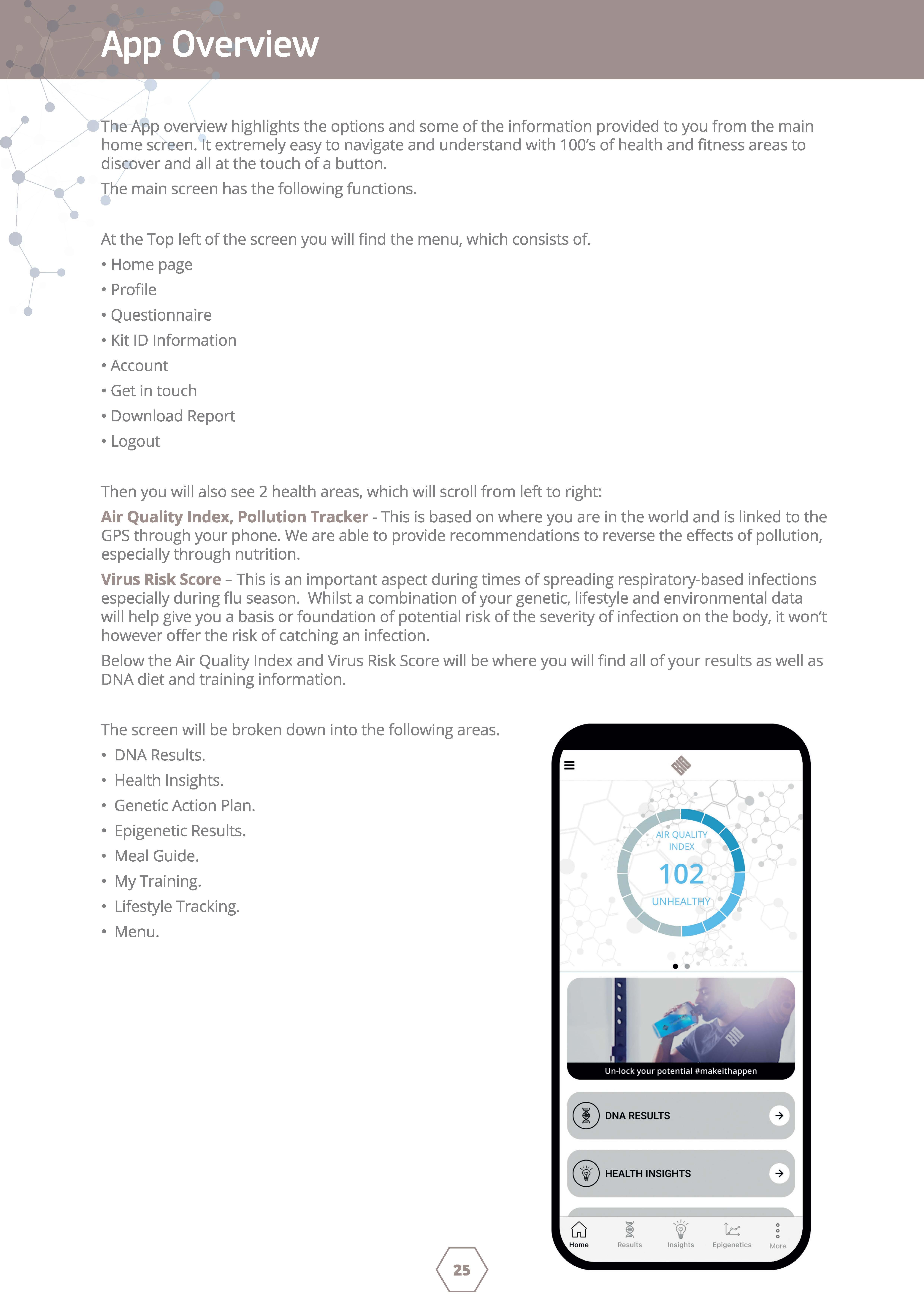 • provide you with a whole variety of interesting areas, such as Genetic Calories Burn Rate, Caloric Daily Split, Macronutrients, Water Intake, Supplements and selected Recipes aligned with your food preferences, goal and genetic vitamin and mineral deficiency risks