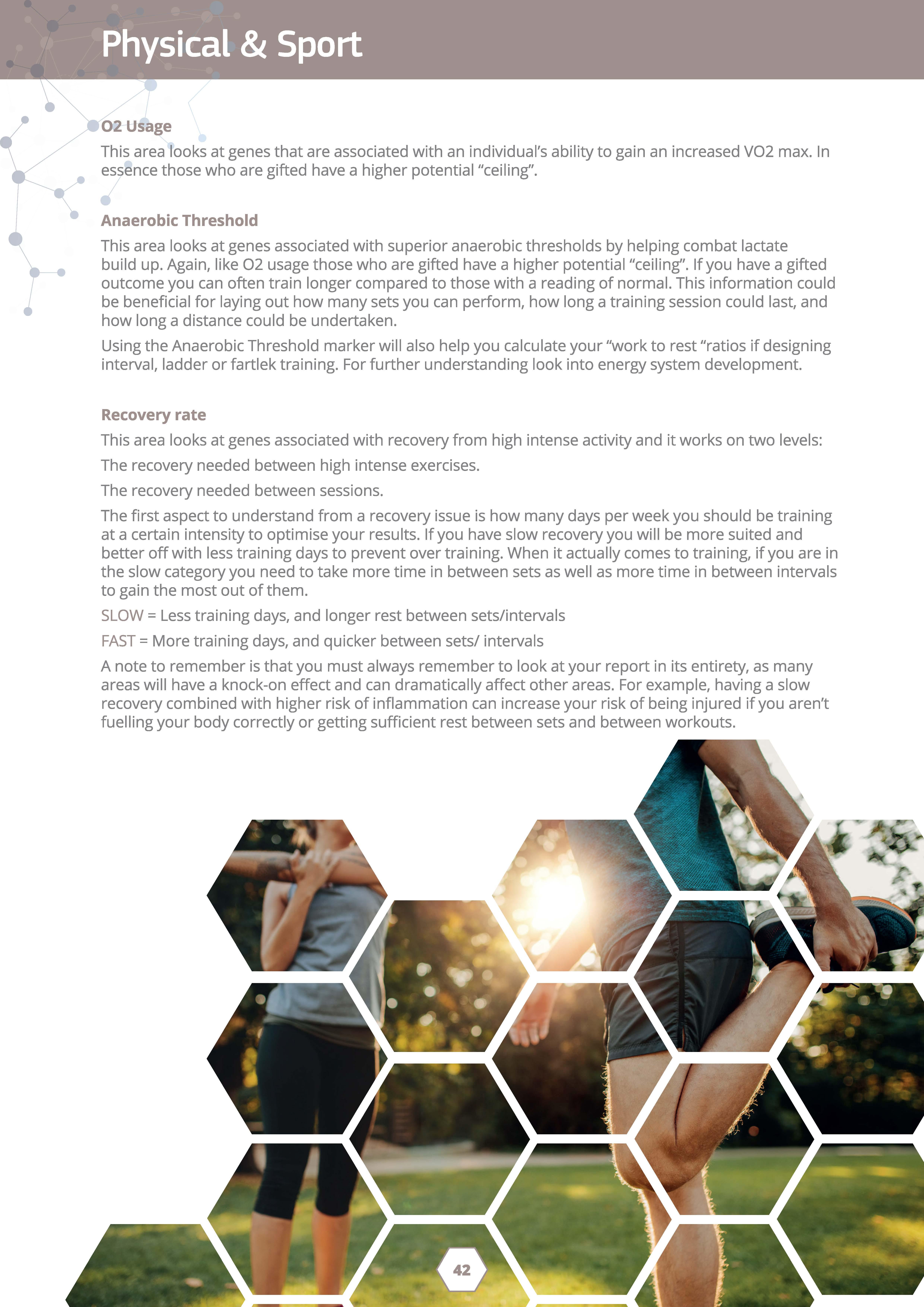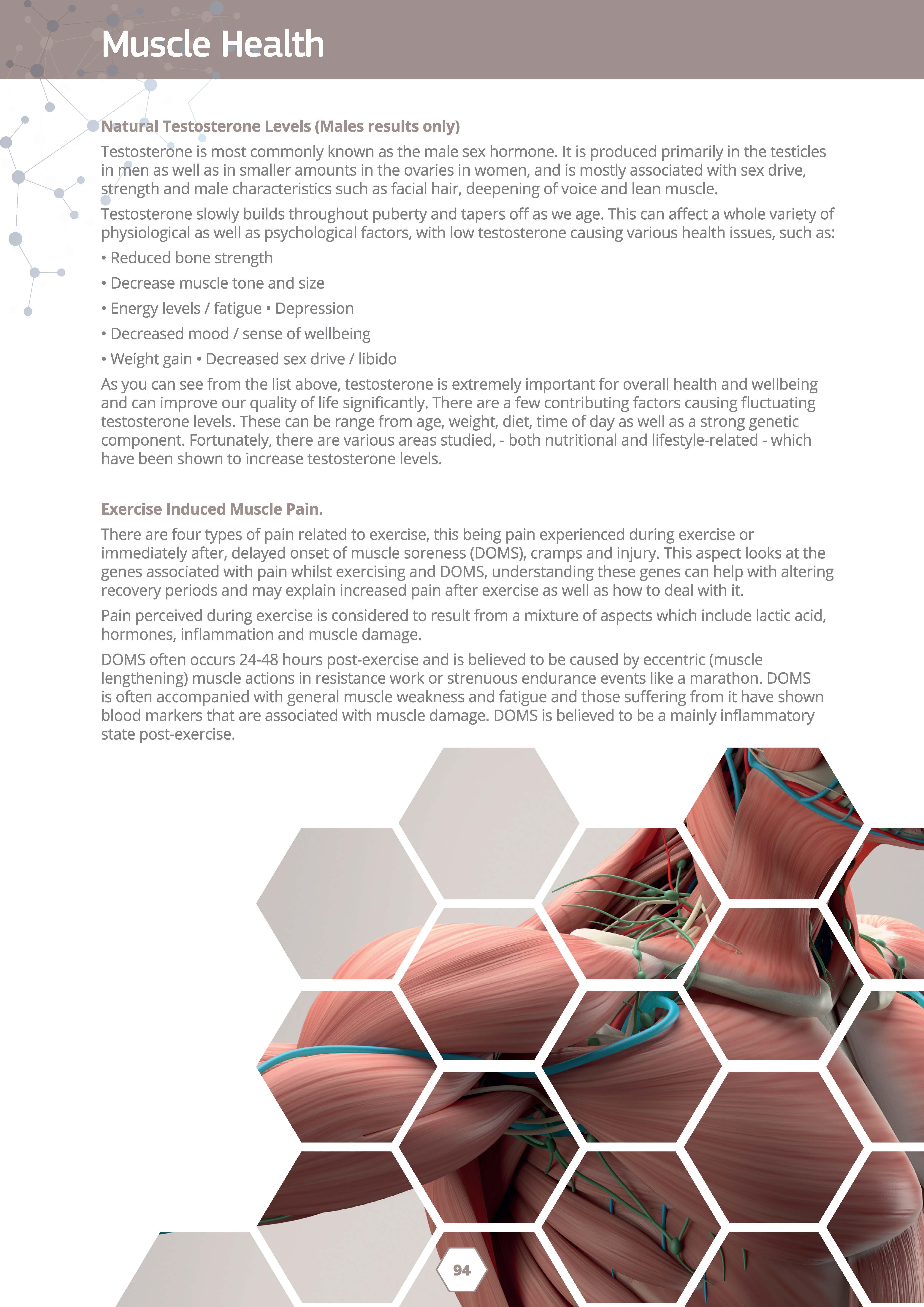This is an area that analyses genes that look at an individual's ability to produce high levels of energy over a short period of time and their affinity to gain fast twitch muscle fibres with power or strength-based training. If looking to gain muscle power through training you need to look at lower reps, higher sets and more rest. The idea is to move a heavier weight to damage the muscle fibres more, the weight needs to be under control.