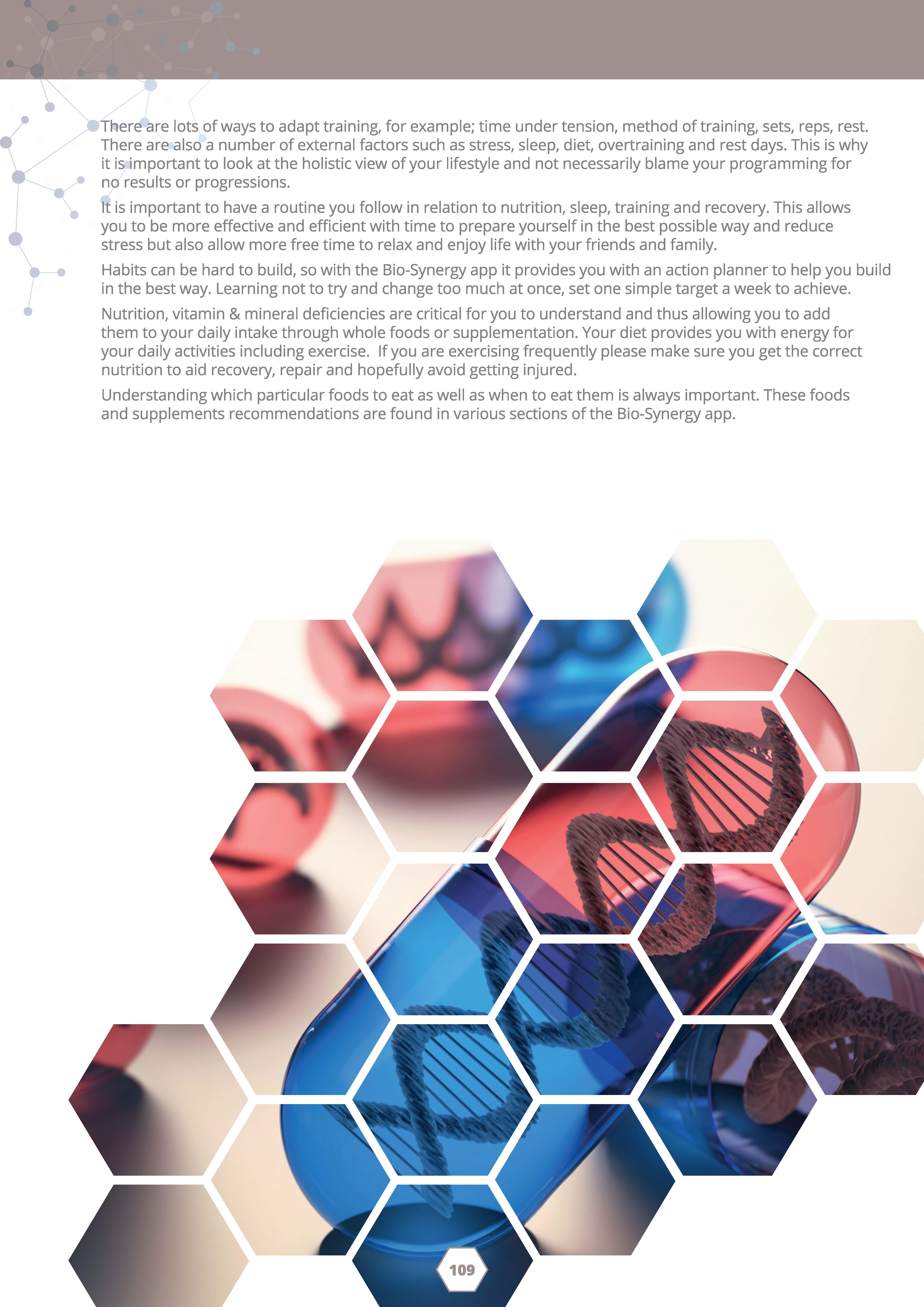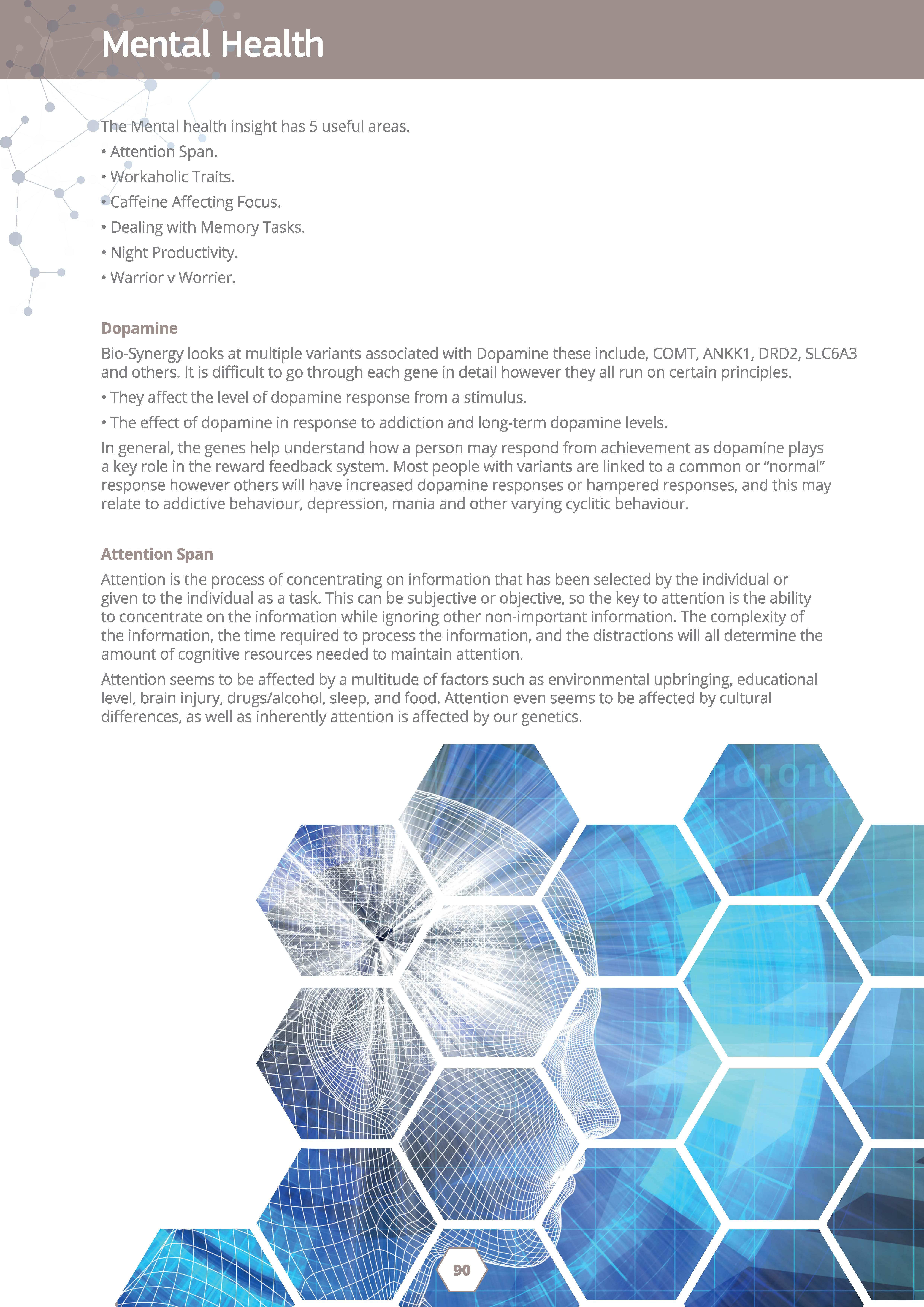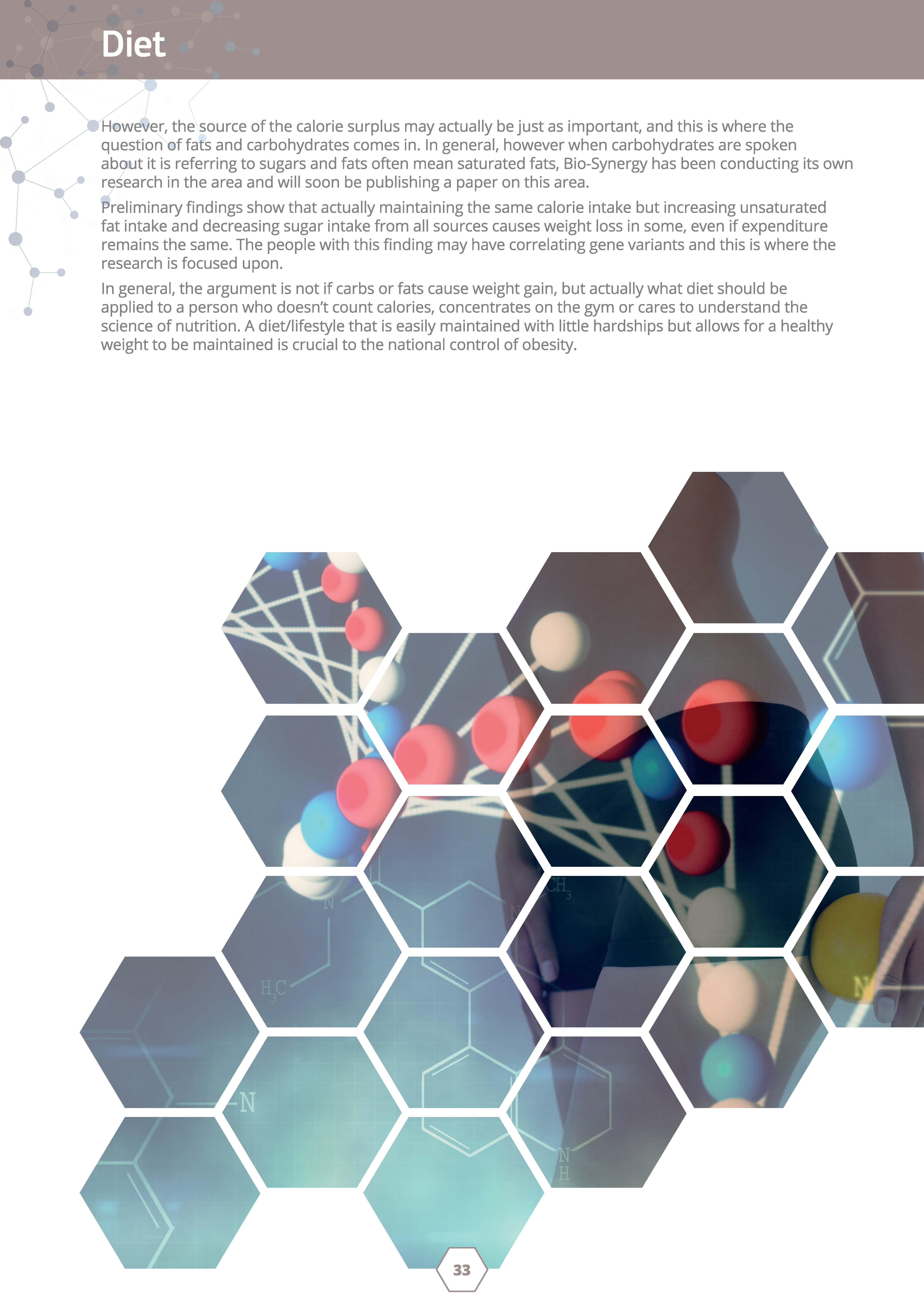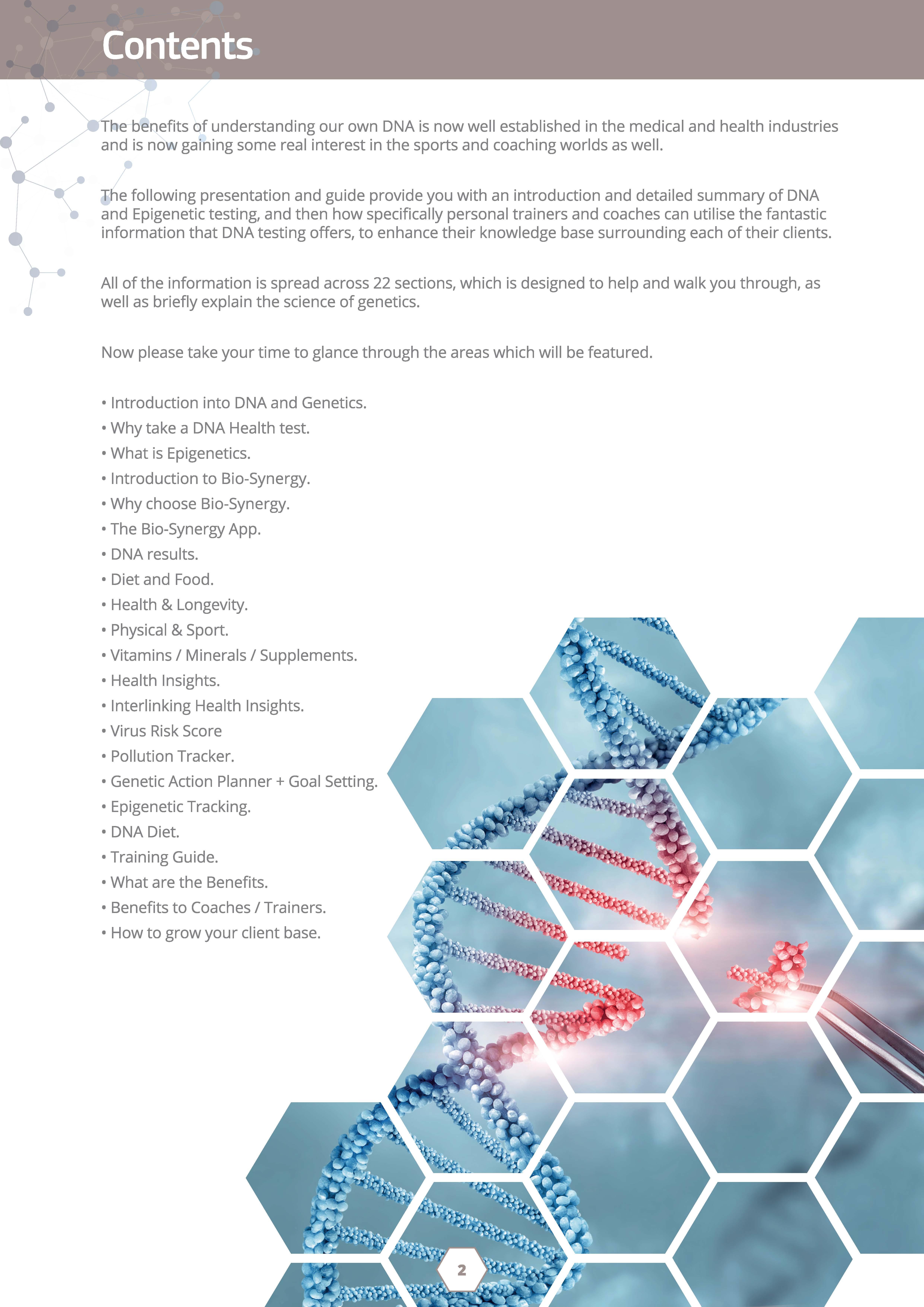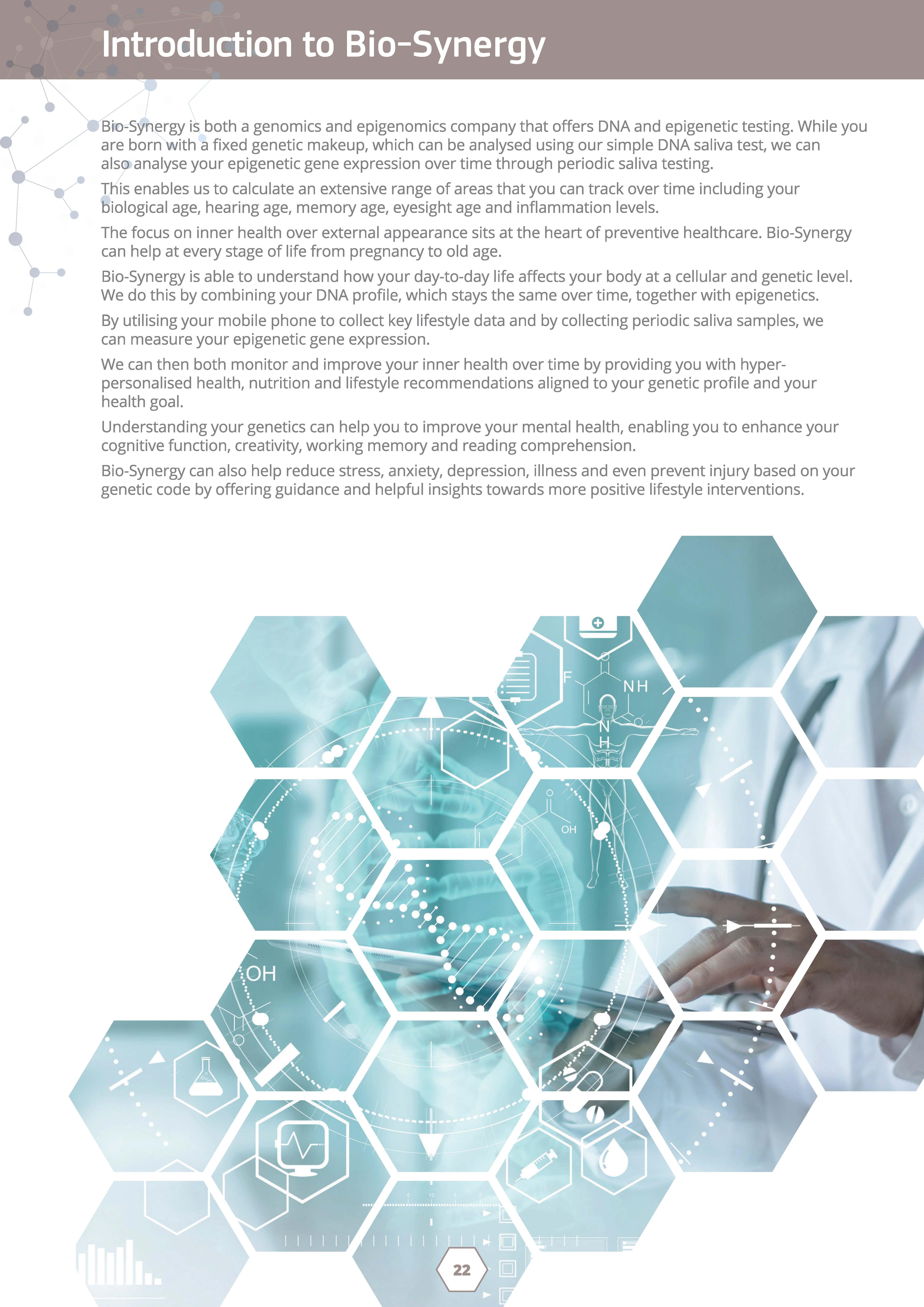 The good news is that with Bio-Synergy you can actually start to track and see how the effects of your day-toclay life such as your diet, exercise, stress, sleep as well as your environment are having on your genes and internal health.