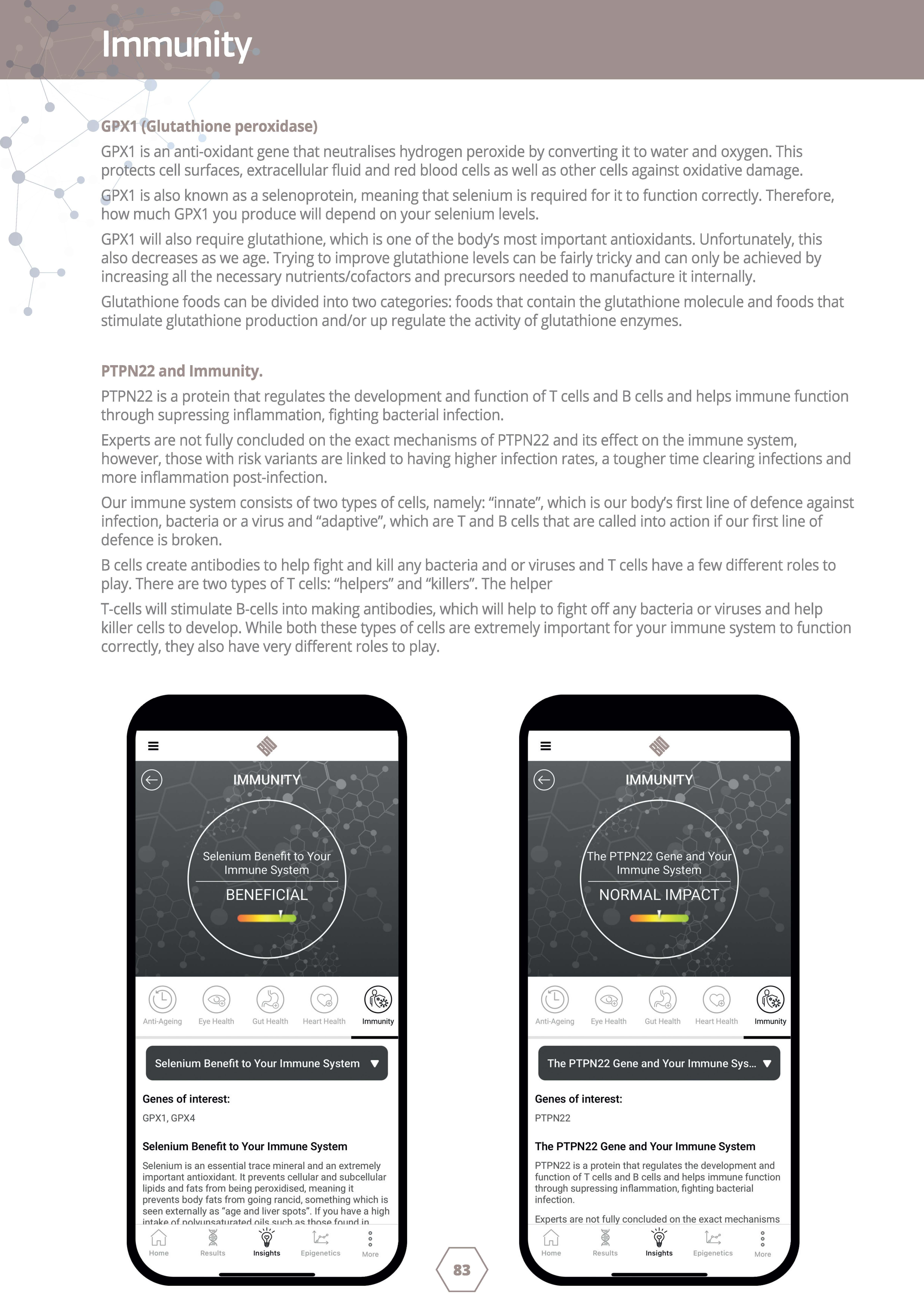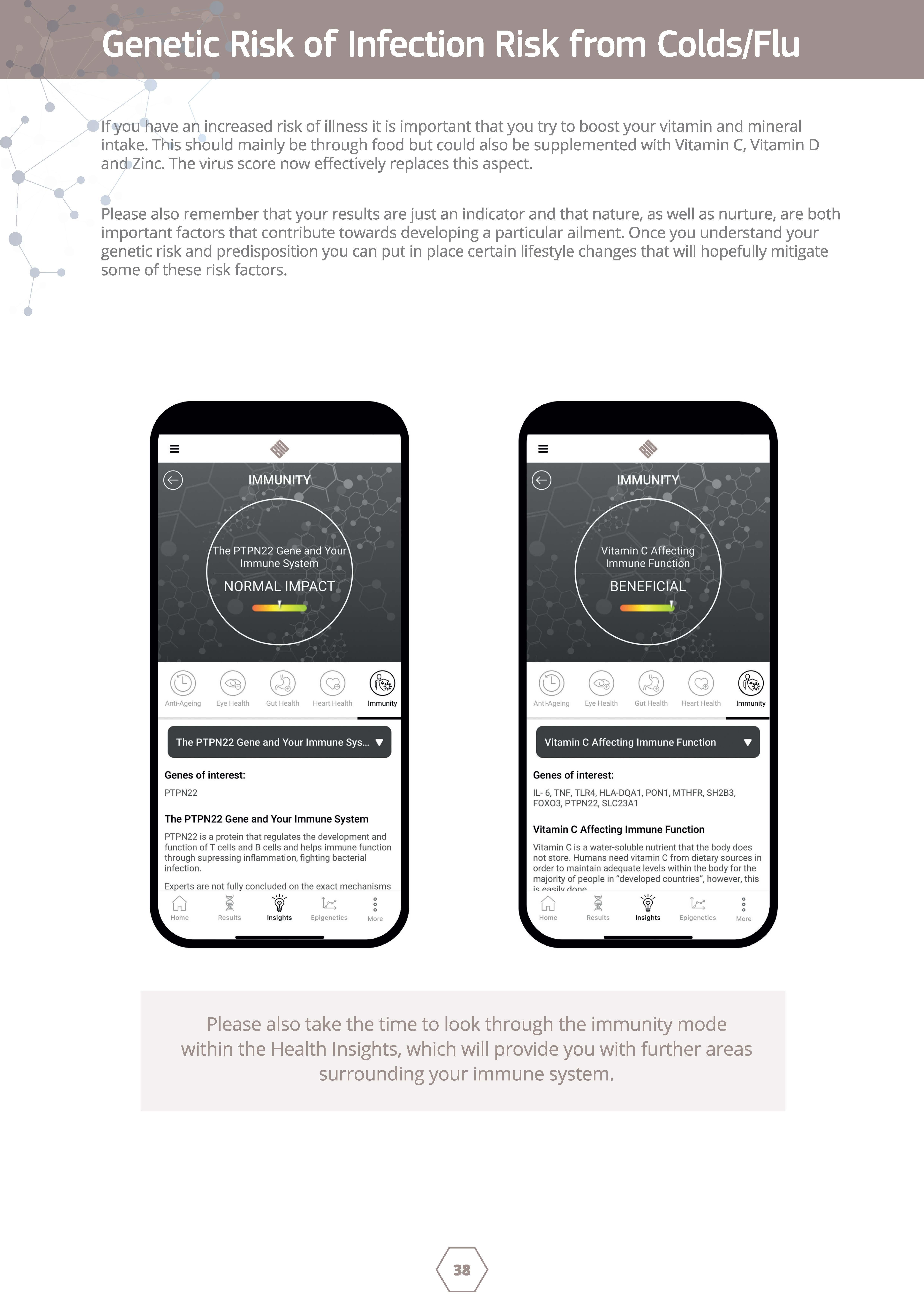 Anti-Ageing Eye Health Gut Health Heart Health Imm unity The PTPN22 Gene and Your Immune Sys " Genes of interest: PTPN22 The PTPN22 Gene and Your Immune System PTPN22 is a protein that regulates the development and function of T cells and B cells and helps immune function through supressing inflammation, fighting bacterial infection Experts are not fully concluded on the exact mechanisms CJ i -w tt:: Home Results Insights Epigenetics More Anti-Ageing Eye Health Gut Health Heart Health Immun ity Vitamin C Affecting Immune Function " Genes of interest: IL-6, TNF, TLR4 HLA-DQA1, PON1, MTHFR, SH2B3, FOX03, PTPN22, SLC23A 1 Vitamin C Affecting Immune Function Vitamin C is a water-soluble nutrient that the body does not store. Humans need vitamin C from dietary sources in order to maintain adequate levels within the body for the majority of people in "developed countriesH, however, this is:: .,:,:1s::ilvrlnn.,:, Home Results Insight s Epigenetics More Please also take the time to look through the immunity mode within the Health Insights, which will provide you with further areas surrounding your immune system. 0
