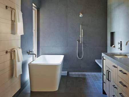 The bathroom is both dark and mysterious, reflecting the unknown of the rugged landscape. Its dark tile and sleek white tub contrast beautifully to form a sophisticated and more modern style. We love the large scale tiles that cover the walls, matching the dramatic effect of this room. &