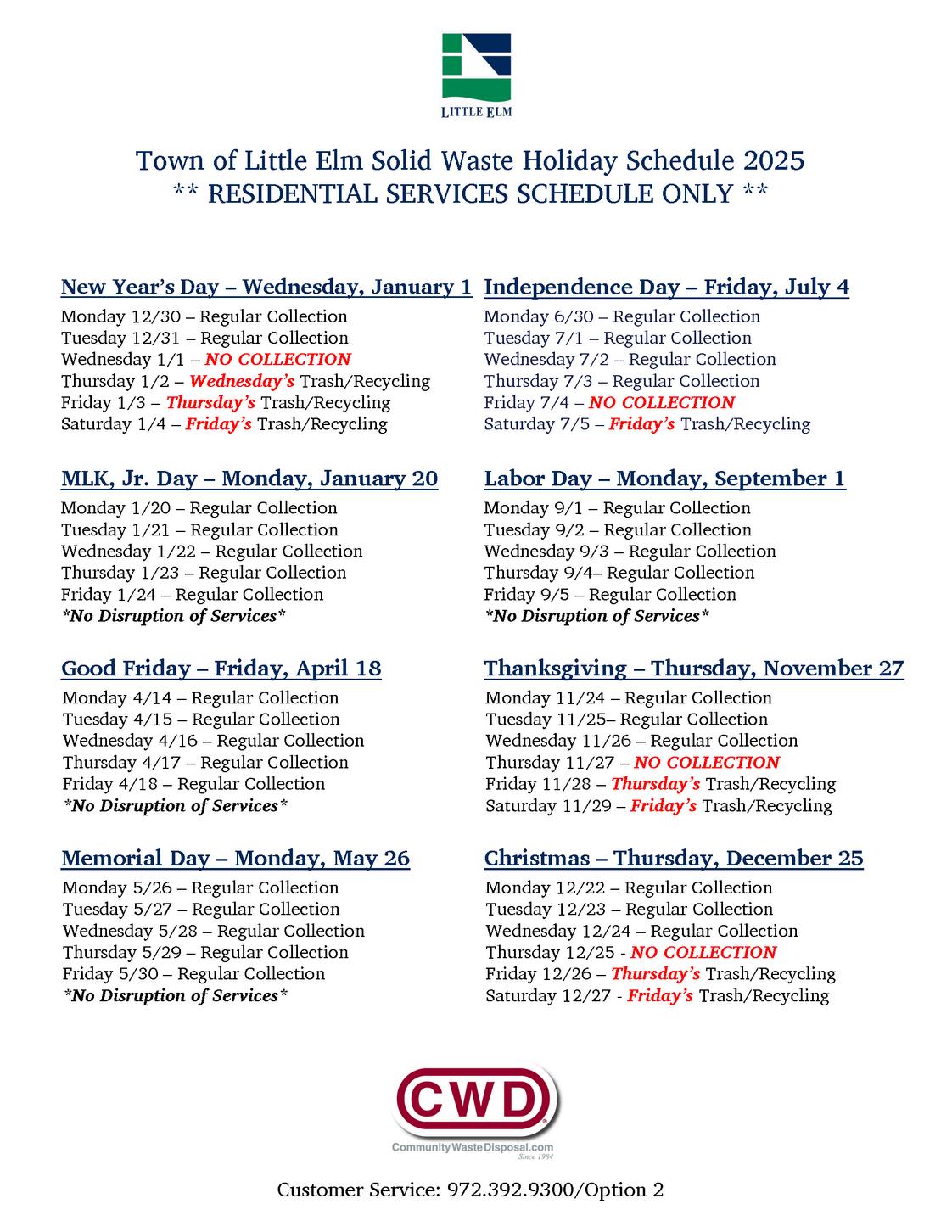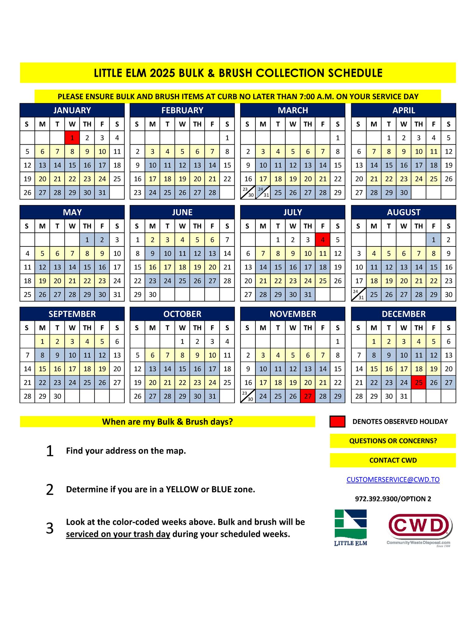 The Town of Little Elm contracts solid waste and recycling services out to Community Waste Disposal (CWD). Trash and recycle pick up occur on the same day each week.