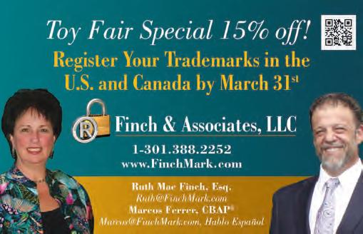 In regard to intellectual property (IP) protection, the Association remains steadfast in fighting counterfeit and violative products on behalf of the industry by proactively working with congressional offices, educating lawmakers and staff on The Toy Association’s IP white papers, and educating the public on the responsible toy businesses that adhere to the more than 100 safety standards required by federal law. This follows the successful coalition work we participated in to secure passage of the INFORM Consumers Act. Our most recent efforts addressed members’ priorities with the U.S. Patent and Trademark Office (USPTO) regarding anti-counterfeiting strategies and we continue to press congressional leaders for the reintroduction of the SHOP SAFE Act, a bill that emphasizes the need for online platforms to meet the same requirements and liabilities as traditional brick-andmortar businesses.
