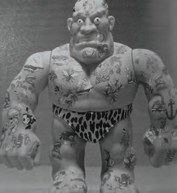 Tony the Tattooed Man is Mattel’s bare-skinned, muscle-bound figure dressed in leopard print shorts. Tony comes with three sheets of wild and weird temporary tattoos that a child can apply to his own skin or the doll’s. The tattoos easily wash off with soap and water.