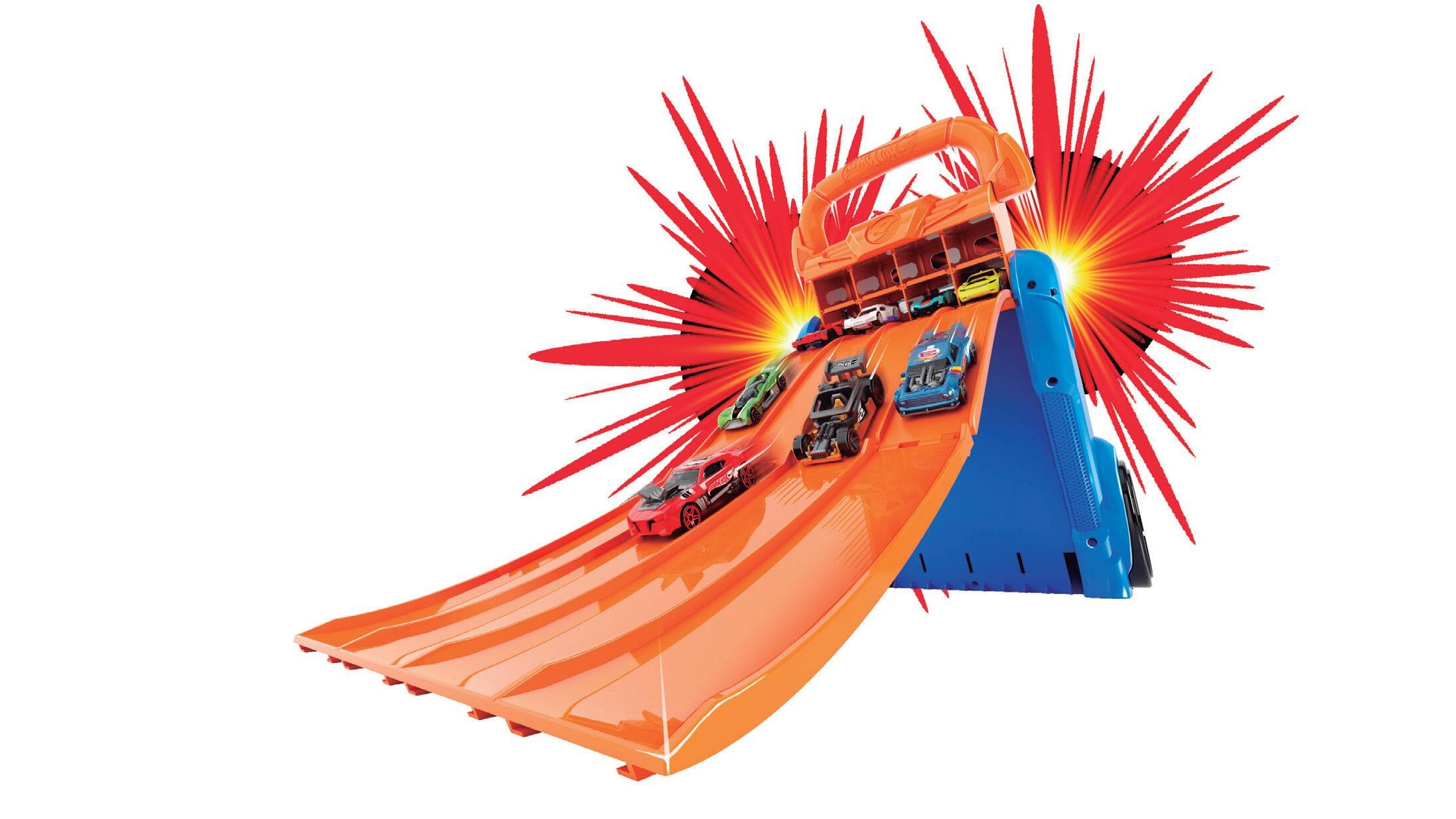 Perfect for racers looking for the ultimate set-up, the mains-powered Hot Wheels 6.4 offers even more track, all the features of the 4.9 set, plus a high-banked curve and crash-inducing crossover section for maximum fun. Ergonomically styled hand controllers regulate car speed, with those included in 4.9 and 6.4 metre sets featuring an additional turbo button that enables momentary bursts of additional speed when needed. Kids will need to strike a balance between all-out racing on the straights and the need to slow down momentarily for corners to take the chequered flag - and victory.