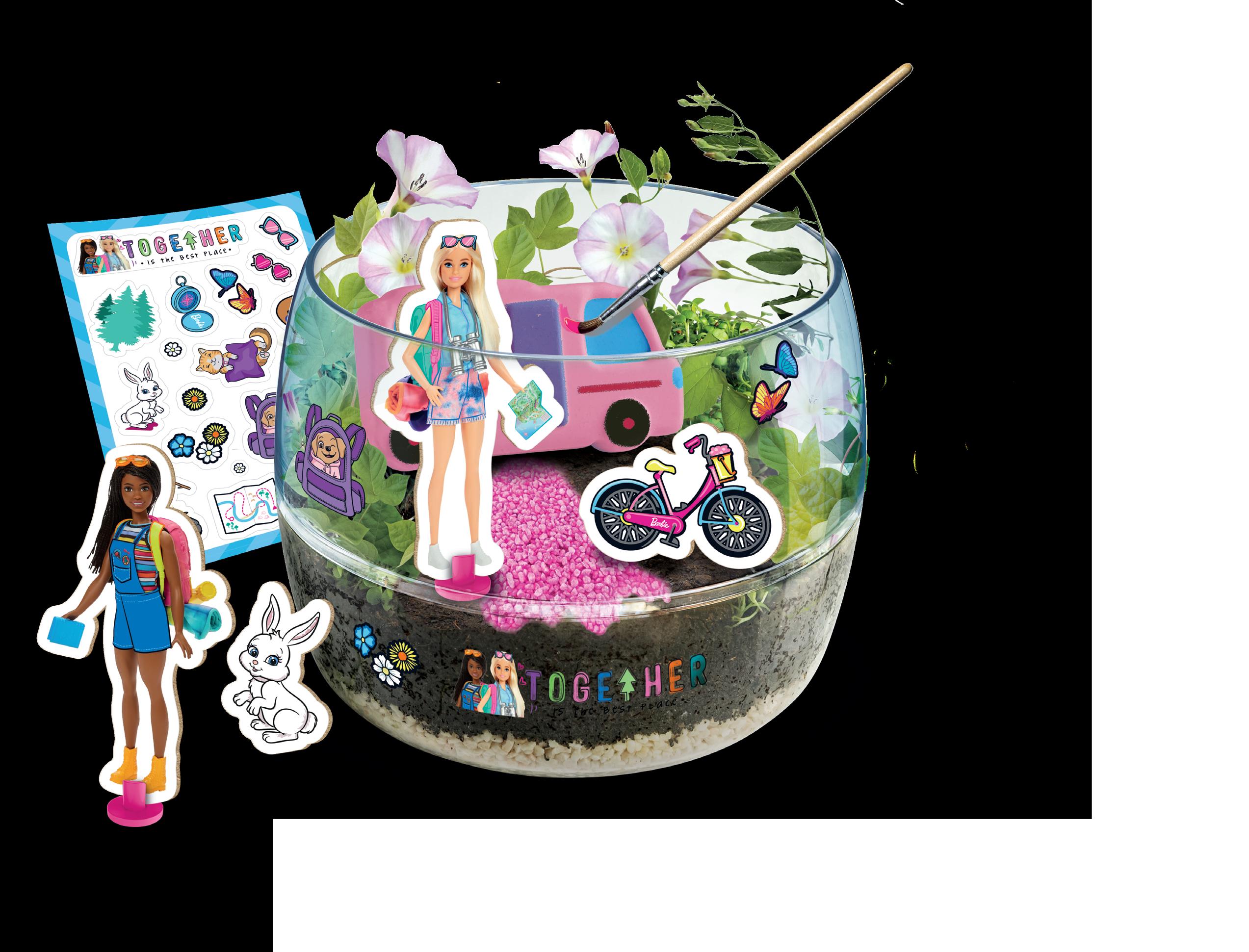 The Barbie Terrarium kit has a unique design that invites kids to create a miniature ecosystem in perfect Barbie style. Children will have fun while they learn the importance of taking care of their plants, and can enjoy building the ecosystem using the seeds, soil, coloured sand and stones included. They can then decorate it using chalk, stencils, stickers and tempera colours.