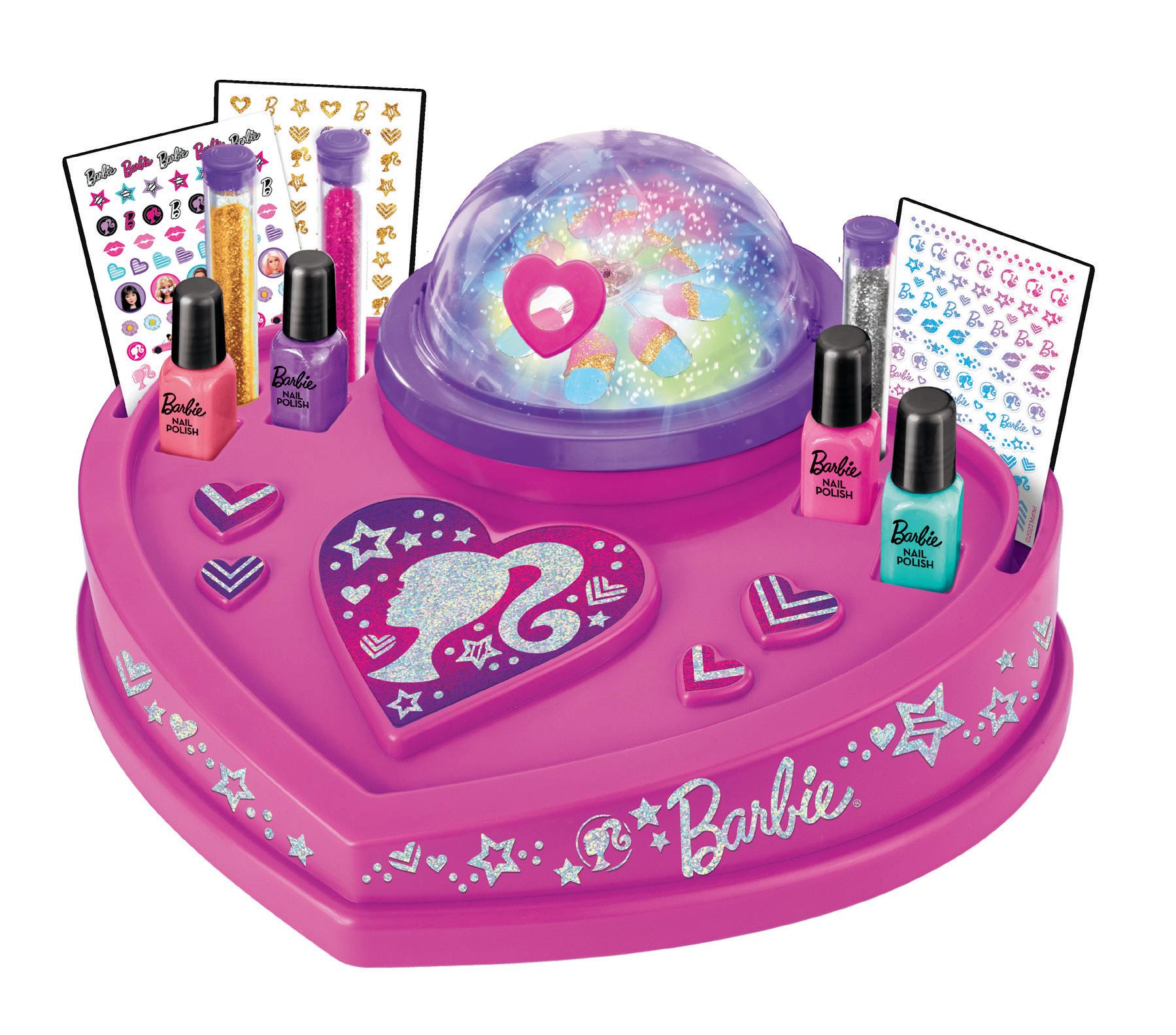 The Barbie All in One Glitter Nail Studio allows children to design and create amazing sparkling nails. Through interactive play, users will become creative artists as they paint, glitter and decorate their nails. A colour changing lightup dome, where glitter is added to create the finished nail look, adds to the excitement. The unit comes with nail polish and all the accessories kids need.