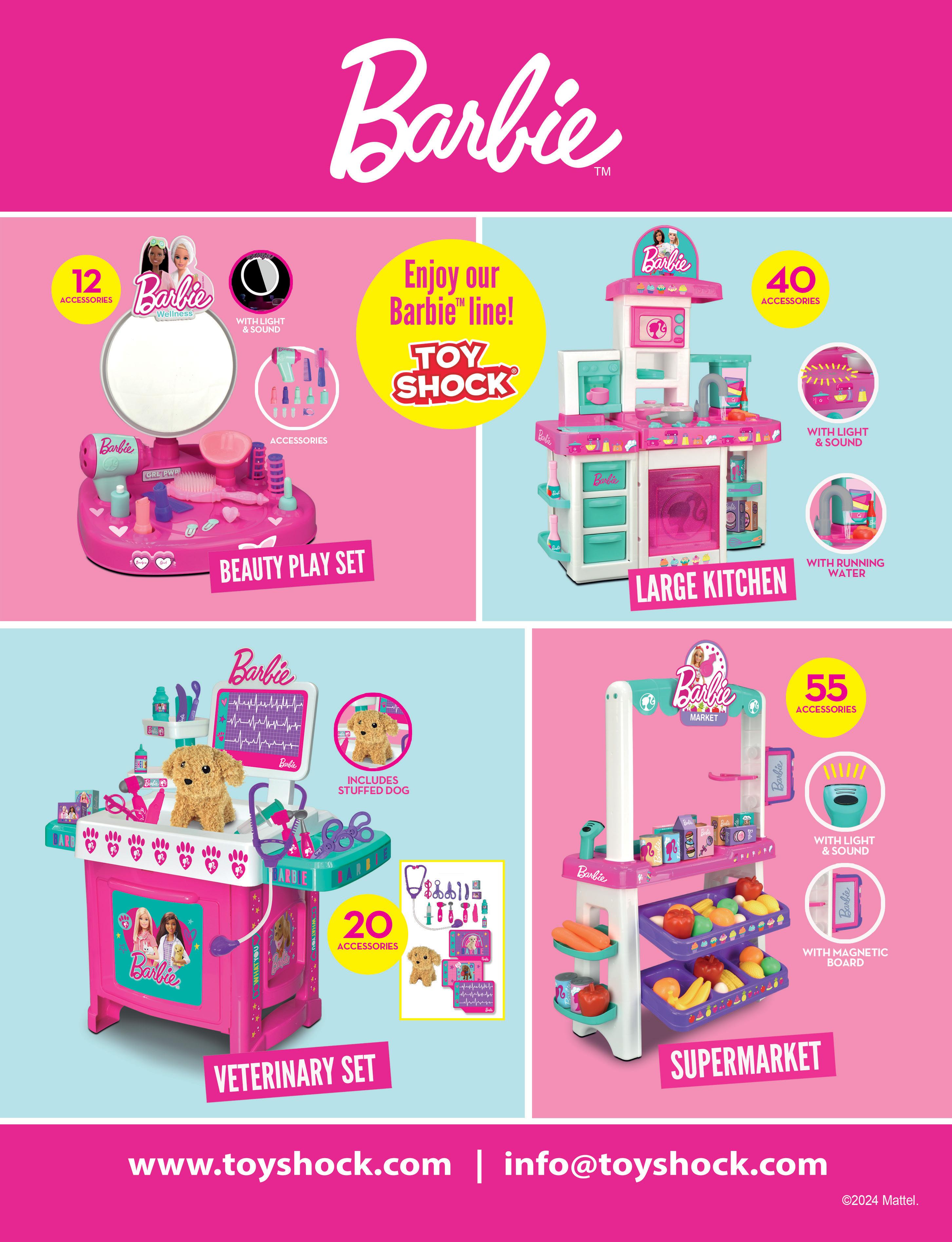 Toy Shock’s Barbie Large Role Play Line goes beyond ordinary play sets, offering an immersive experience filled with light, sound and a wealth of accessories that make every playtime moment feel real. Each set in this collection is packed with an impressive number of detailed accessories that open up endless possibilities for storytelling and creative play. The Vanity Set comes with 12 accessories, including lights and sound, creating the perfect environment for glamorous makeovers. The Supermarket Set is even more elaborate, with 55 accessories and sound features that bring the hustle and bustle of shopping to life. The Kitchen Set, meanwhile, boasts 40 accessories with both lights and sound, allowing young chefs to cook up a storm with realistic effects. Perfect for those who dream of caring for animals, the Veterinary Set comes with 20 accessories as well as lights and sound, making the pet care experience truly engaging. From fashion design to cooking, shopping and veterinary care, there's a role play set in this collection for every child.