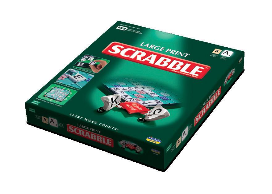 The Large Print edition has extra-large tiles plus rules and a playing board designed for players with poor eyesight, specially developed in conjunction with the RNIB. The patented TileLock technology ensures that tiles slip easily into place and do not shift when the board is rotated. A Braille version is also available.