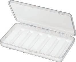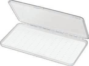 Lightweight and compact boxes ideal for dry flies and nymphs. The clear lid is combined with a white base. This allows a clear view of the contents. The high-density foam base has deep slots for secure hook placement.