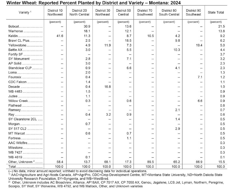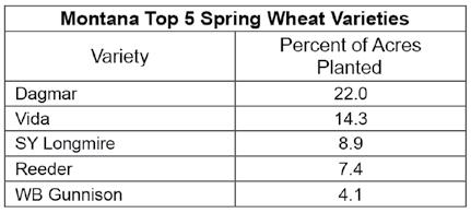 Yellowstone ranks fifth in winter wheat acres, representing 5.1 percent of planted acres. Yellowstone was released in 2005, and developed by the Montana Agricultural Experiment Station. Yellowstone is marked by high yields, medium test weight, height, maturity, and grain protein. It has good milling, and excellent baking qualities. It shows resistance to stripe rust, but is susceptible to stem rust. It is also winter hardy.