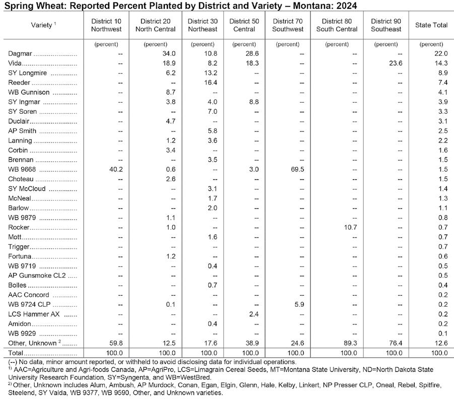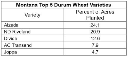 Alzada is ranked as the most common Durum variety, representing 24.1 percent of Montana’s total Durum wheat acreage planted. Alzada was developed by WestBred, LLC in Bozeman, Montana, and was first released for commercial planting in 2004. The variety has competitive yields, along with excellent straw strength and good sawfly tolerance. Alzada has a hightest weight, protein content, and demonstrates good scores for semolina color and gluten strength.