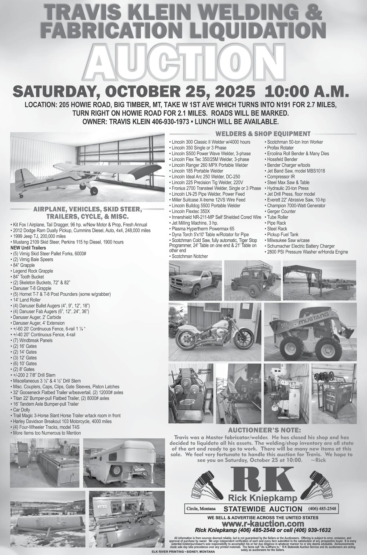 Oct 25, RK Statewide Auction, Travis Klein Welding & Fabrication Liquidation, Big Timber MT A8
