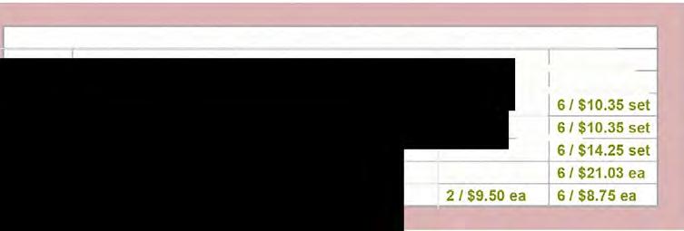 12 / $4.60 ea 12 / $4.40 ea12 / $4.50 ea12 / $5.50 ea 12 / $5.60 ea6 /$7.45 ea ,-24 / $2.55 ea 12 / $5.80 ea 12 / $6.50 ea 6 / $21.40 ea 1139-6