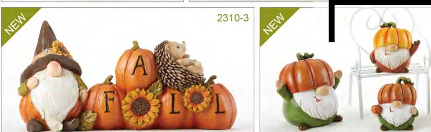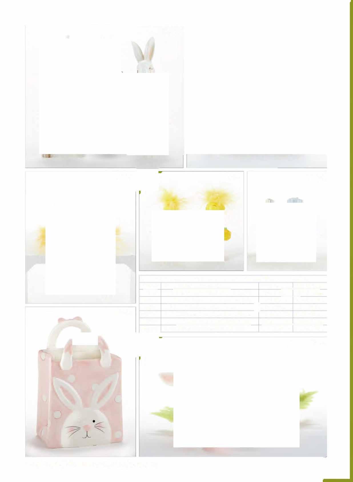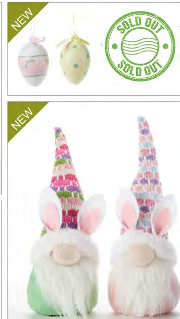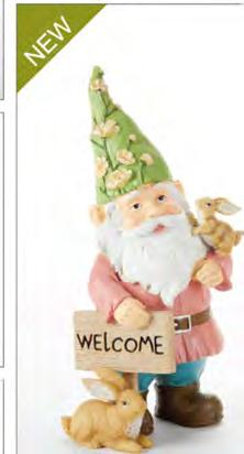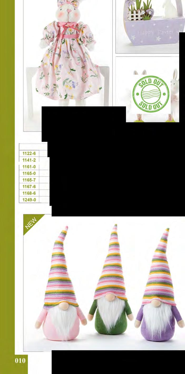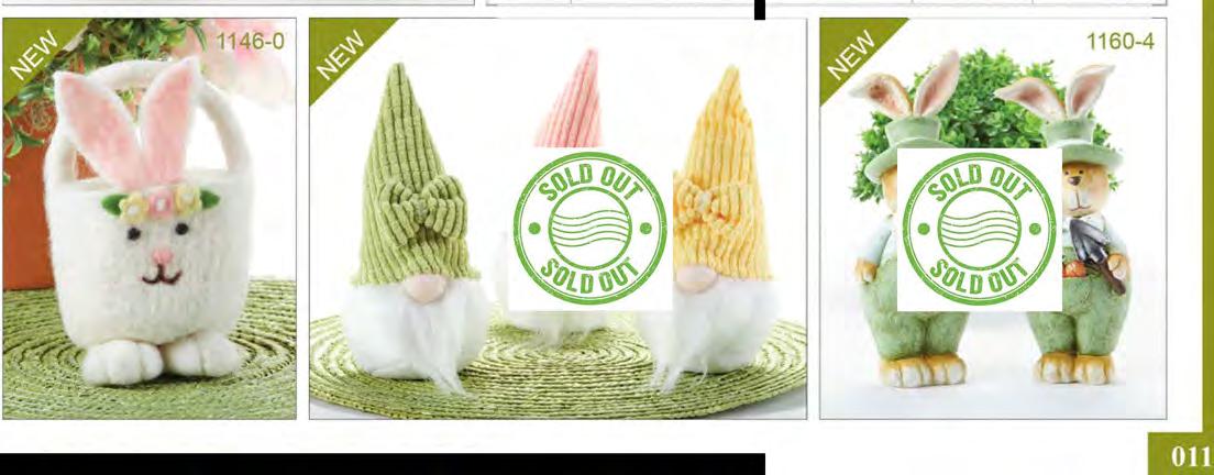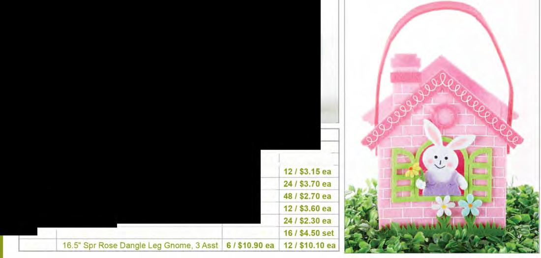 1123-1 7.2 x 3" Resin Hippity Hop Sign 2I $9.15 ea 6 I $8.35 ea 1141-3 4.4" Resin Chick wl Basket, 2Asst 41 $6.40 ea 121 $5.90 ea 1146-0 3.5 x 5.5" Wool Bunny Basket 61 $4.25 ea 12I $3.95 ea 1156-6 3 2 x 7.7" Resin Country Rabbit, 2Asst 41 $9.00 ea 12I $8.35ea 1160-4 2.4 x 5.9" Resin Green Bunny, 2Asst 4I $5.10 ea 121 $4.70 ea 1246-6 3 x 6.7" Spr Bow Hat Gnome, 3Asst 61 $3.75 ea 18I $3.45 ea 4352-0 5.5 x 4.5" Resin Hanging Sign, 2Asst 41 $4.75 ea 121 $4.40 ea 4364-3 3.2 x 6.3" Resin Forest Gnome, 3Asst 61 $7.90 ea 121 $7.35 ea 1246-6