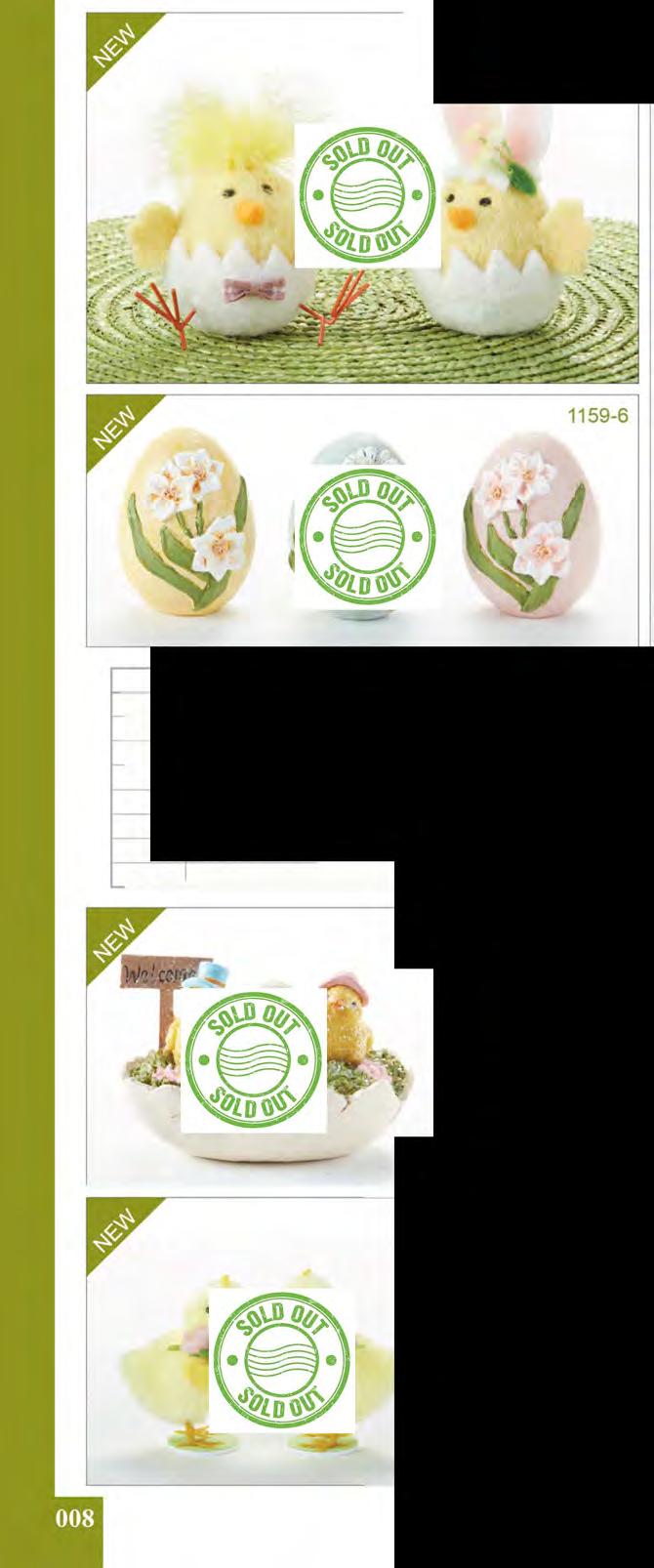 24/$2.10ea 48/$1.95ea 3 /$8.65ea 9 /$8.15ea 2 /$15.50ea 6 /$14.50ea 12 /$3.30ea 24/$3.07ea 1151-3 4.7 x 3.2" Resin "Welcome" Chick Trio in Egg 8 /$5.00ea 16/$4.60ea 1159-6 2.4 x 3 2" Resin Floral Spring Flower Egg, 3 Asst ] 12 /$2.50ea 24/$2.30ea 1166-5 4.13" Standing Yellow Fuzzy Chick, 2 Asst 12 /$1.75ea 24/ $1.60ea 1151-3 1128-3