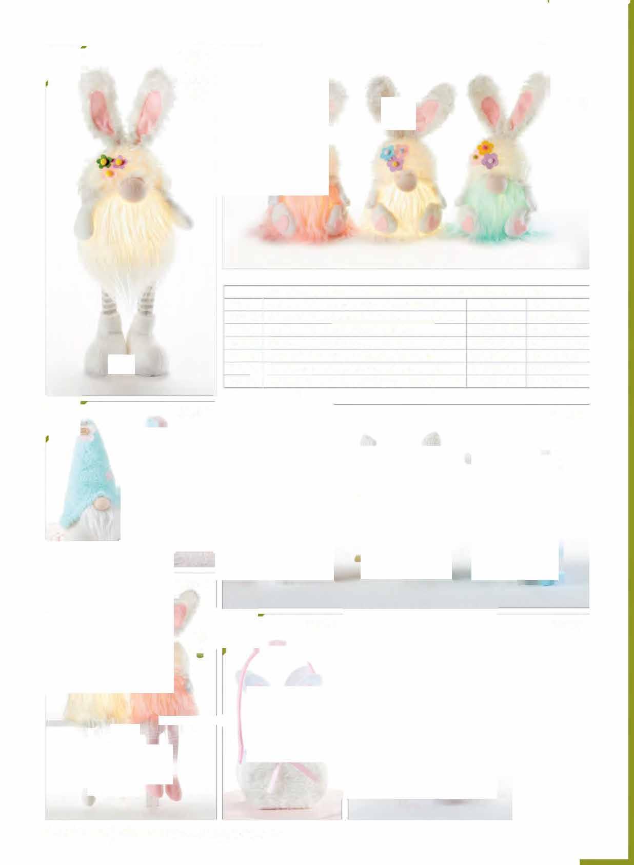 Prices are subject to change without notice. Please verifyprice when ordering. 4 6" x 6 6" Resin Floral Bunny Ear Gnome, 3 Asst 6 / $8.50 ea 12 / $7.85 ea 2.9 x 5 5" ResinDangle Leg Spring Gnome, 3 Asst 6 I $7.15 ea 12 / $6.60 ea 4.3 x 6.8" Felt Fuzzy Bunny Treat Bag 12 / $2.25 ea 24 / $2.10ea 25"Dangle Leg LED Fuzzy Bunny Gnome, 2 Asst 2 / $11.50ea 12 / $10.70ea 5 1 x 9.9"Daisy Fuzz Pudgy Gnome, 2 Asst 4 / $5.85 ea 12 / $5.50ea 3 / $8.85 ea 24 / $8.30 ea 12" Sitting Bunny Ear LED Fuzzy Gnome, 3 Asst --jf-----"'1247-9 18" Standing LED White Bunny Ear Fuzzy Gnome 2 / $13.00 ea 6I$12.00ea 1150-0 1161-6 1155-7