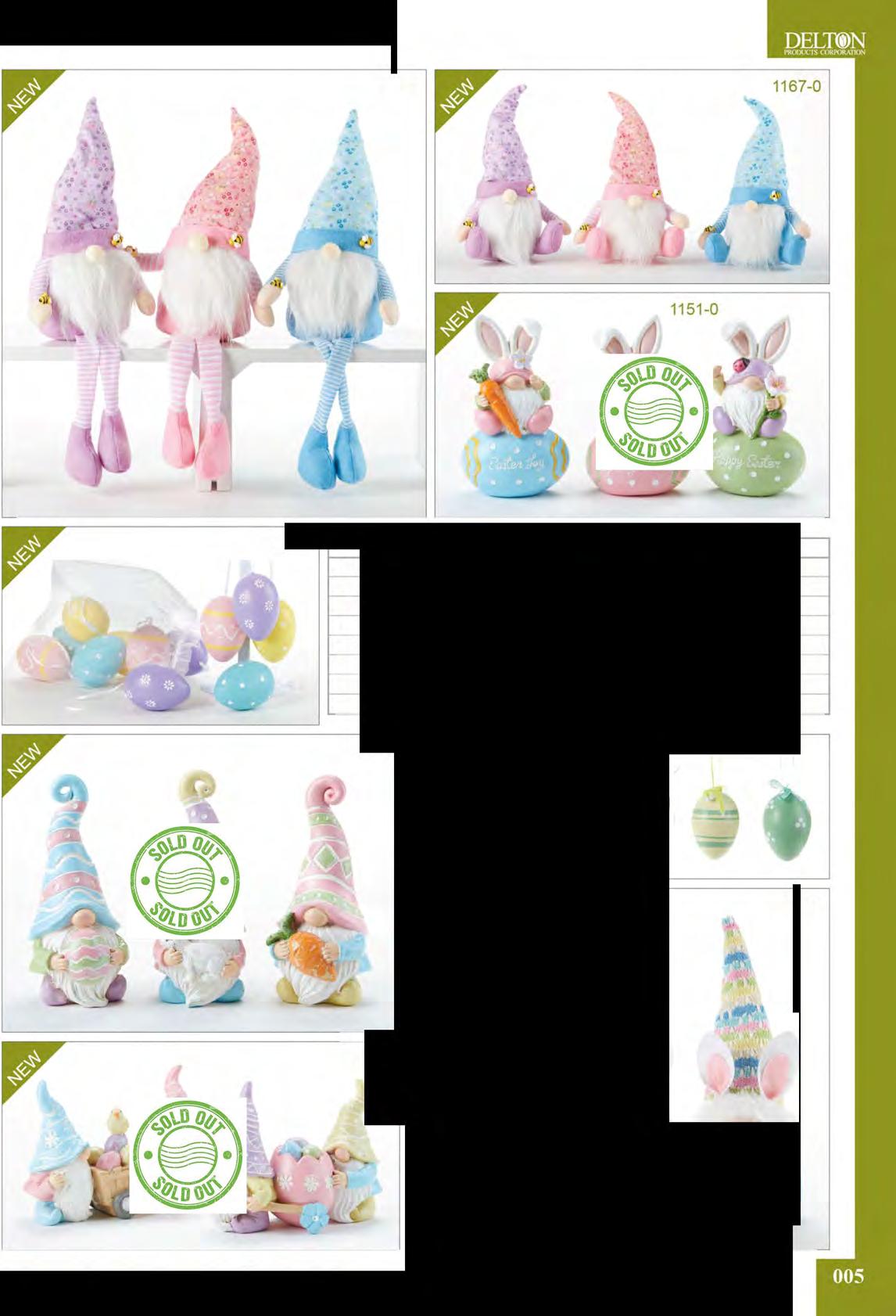 Prices are subject to change without notice. Please verifyprice when ordering. 1150-2 5.9 x 4.5" Resin Egg Cart Gnome, 2Asst 4/ $7.25ea 121 $6.75ea 1151-0 3 2x 5.2" Resin Gnomeon Egg, 3Asst 61 $5.00 ea 121 $4.60 ea 1151-2 3 x6.3" Resin Easter Gnome, 3Asst 6/ $5.30 ea 121 $4.88 ea 1165-0 2 x 3.2" Plastic 12 pc EggSet in Bag 12 I$7.00set 24 I$6.45set 1165-4 1.6x 2.5" Plastic Easter Egg, Setof6 4/ $2.50 set 24 I $2.35 set 1167-0 13" Sitting Bumble Gnome, 3Asst 3/ $5.30 ea 121 $4.90 ea 1168-0 21" Dangle Leg Bumble Gnome, 3Asst 3/ $6.10 ea 12 I $5.60ea 1245-2 7" Ear Knit Hat Gnome Stump, 3Asst 6/ $4.00 ea 241 $3.72 ea