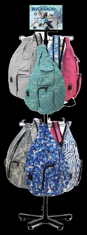 EMPTY 4-Level Display PRICE $50.00 SKU 2137 Orders of 30 bags or more can get the Display Rack for $50 with 2 FREE Day Packs ($60 retail value) Spring Quartet Anti-theft Daypack Reg. + Lrg. Assortment SPRING QUARTET 16PC BEST SELLERS SKU 50373 PRICE $260.00 Reg. Daypack Assortment 12PC SKU 2780 PRICE $180.00 3 OF GRAY BLACK NAVY PLUM Reg. Daypack Assortment A 10PC SKU 2927 PRICE $150.00 2 OF GRAY BLACK NAVY OLIVE BROWN Lrg. Daypack Assortment A 10PC SKU 2929 PRICE $175.00 2 OF GRAY BLACK NAVY OLIVE BROWN Reg. Daypack Assortment B 12 PC SKU 2928 PRICE $180.00 2 OF APPLE GREEN RED PLUM TAN LIGHT BLUE ROSE Lrg. Daypack Assortment B 12 PC SKU 2930 PRICE $210.00 2 OF APPLE GREEN RED PLUM TAN LIGHT BLUE ROSE Anti-theft Daypack Reg. + Lrg. Assortment + FREE DISPLAY 66PC BEST SELLERS / 33 REG. + 33 LRG. SKU 2944 PRICE $1072.50 Lilac in Bloom REG 50291 Navy Yellow Leaves REG 50281 Limoncello REG 50286 Gray Paisley REG 50276 LRG 50292 LRG 50282 LRG 50287 LRG 50277 REG $15.00 LRG $17.50 2023 CATALOG 35 Slings