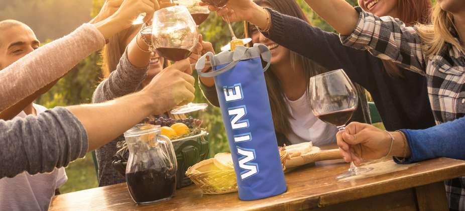 The Napa wine tote is designed to fit both wide champagne bottles and tall Riesling bottles. It is made with waterproof vinyl material that is insulated to keep your drinks cold and keep the ice cubes inside the tote.
