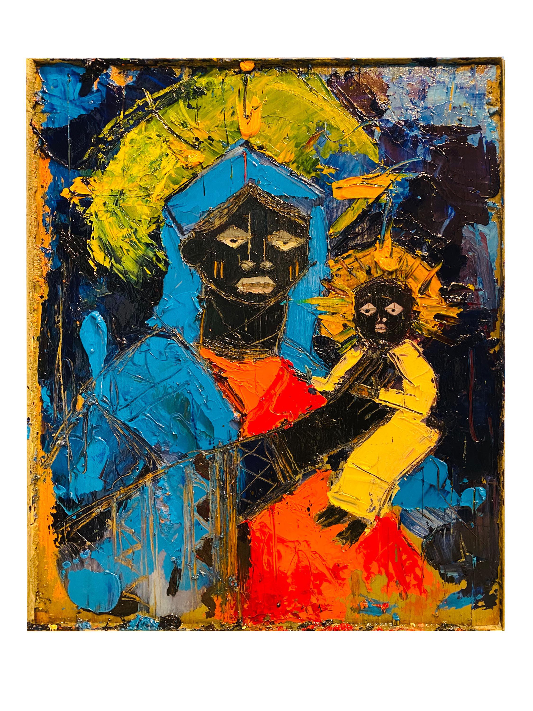 Móyòsóré Martins bridges abstract, figurative, and iconographic symbolism. He expresses the beauty in the figure and the depth of its subject; he obsesses with a cartoon-like character that imbues his personal iconography and that has a deep symbolic meaning. His approach is narrative and realistic in the early works, returning to his childhood memories. The African statue is increasingly present and spiritually meaningful in his work. He is fascinated with contemporary plastic toy statues and collectibles from artists like Kaws, representing everything different in juxtaposition to the traditional Yaruba figures. A seminal work, “Watchman,” resonates; the painting is a study of the Yaruba figure and is interpreted by Martins as the man taking on his destiny, with a nod to his experience while employed as a night watchman in the Bronx—a lasting impression.