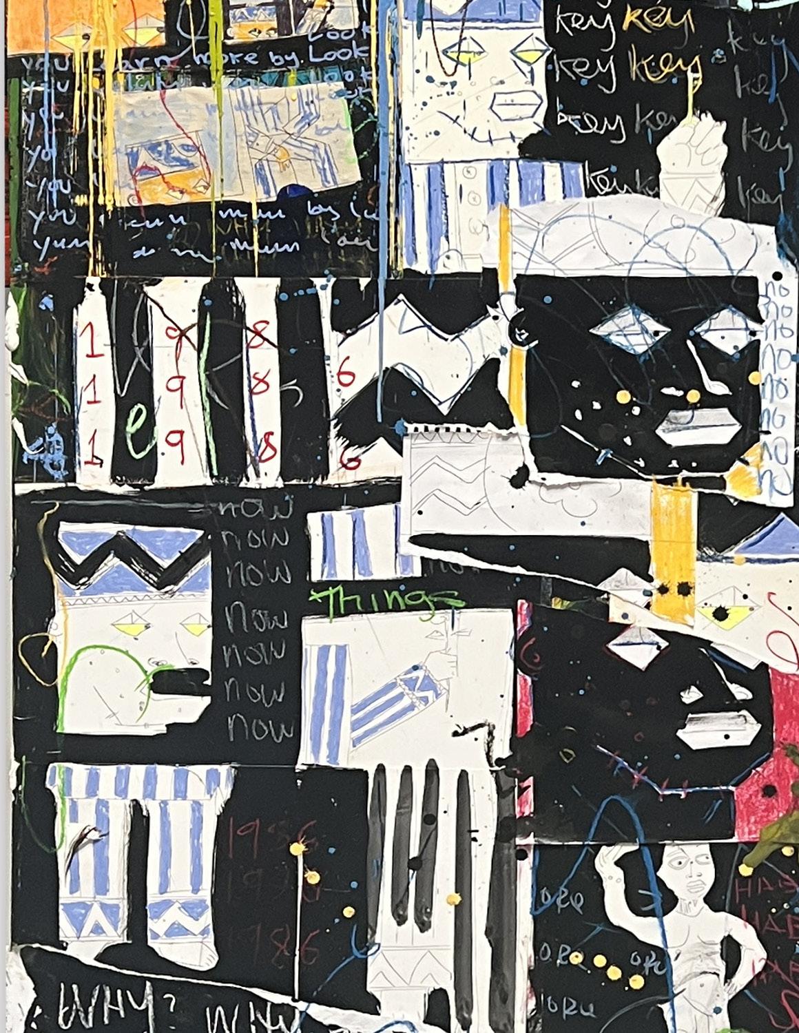 (Oil, oil stick, pigments, ink, graphite, and collage)