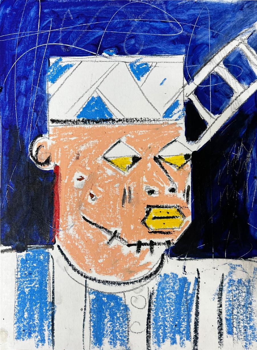 “For me, this painting is very serious. While creating it, I was experiencing a deep and stressful moment. I was going through my naturalization test to obtain my US citizenship. I was struggling to retain information, because my mind was completely consumed by my work. This painting became my outlet. It reflects a sense of glory and success, symbolizing my newfound freedom. The yellow card represents my identity and signifies my life, reminding me that with every achievement there’s always more ahead. The figure of the man portrays vulnerability, showing that despite my success, there were obstacles—like traveling and being truly free. It’s the paradox of feeling free, yet not entirely liberated. The blues and blue-and-white stripes is the traditional royal attire, signifying rank and importance, indicating that I am not just an ordinary person, but someone of significance. For me it also symbolizes freedom.”—MM