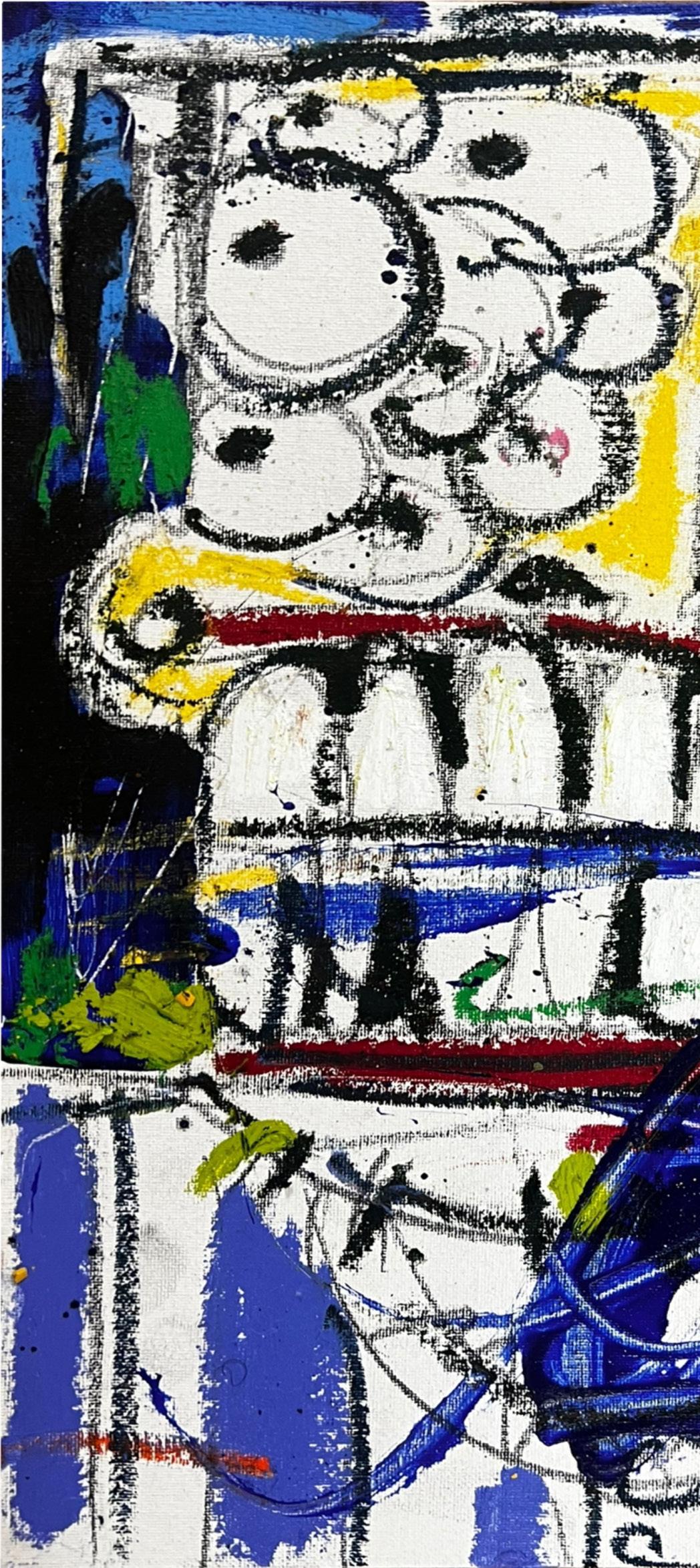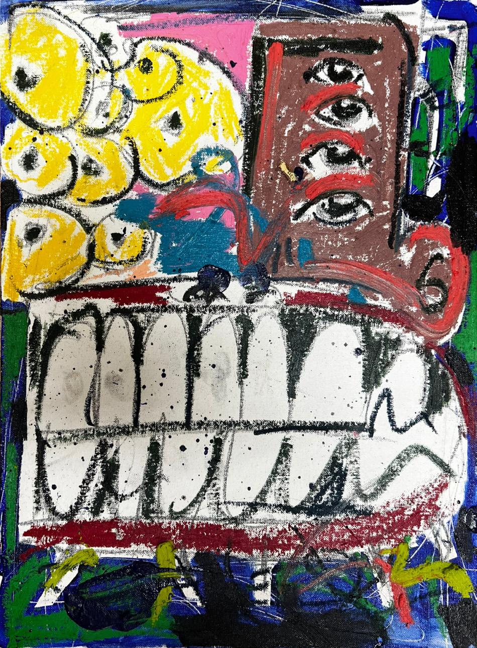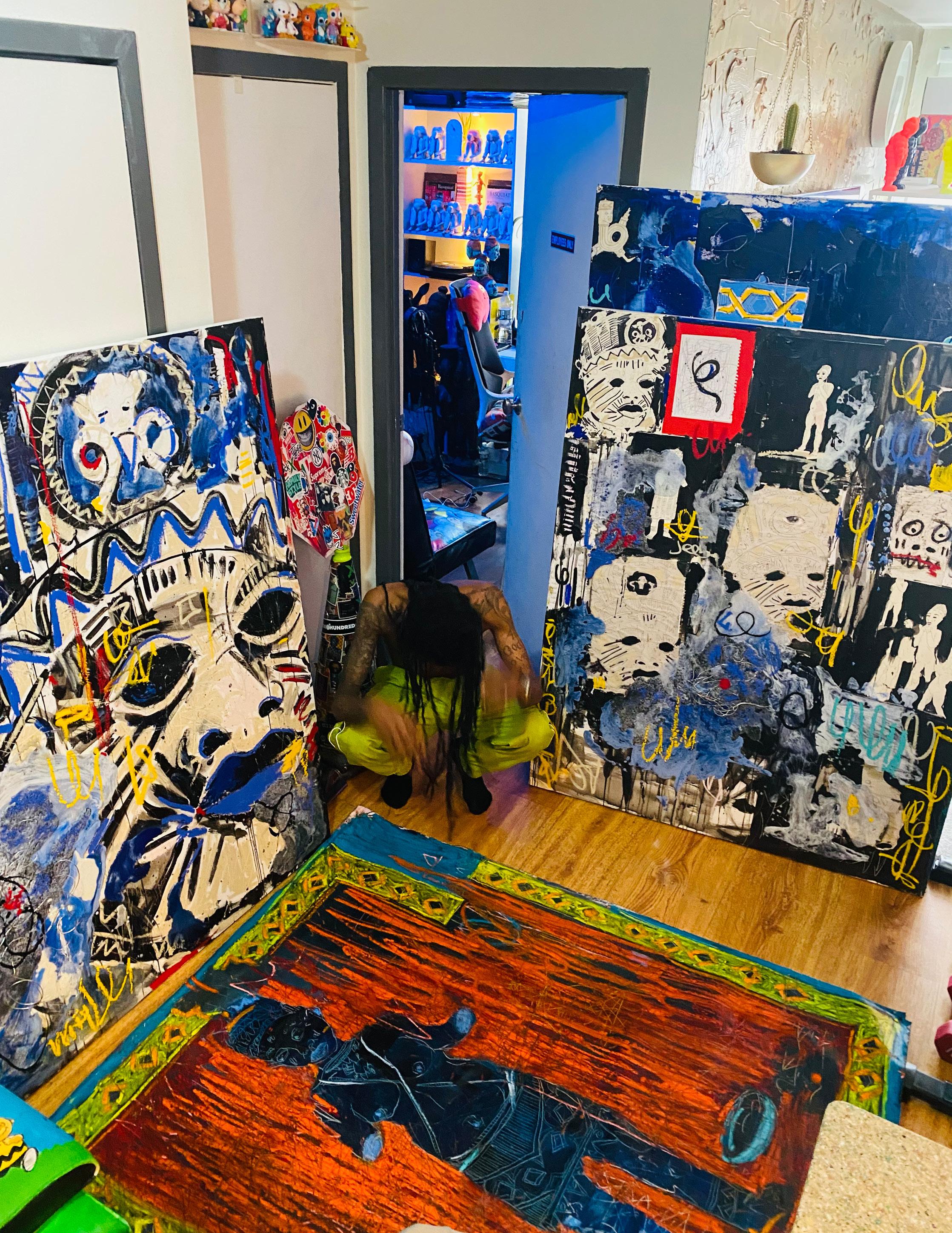 My artwork is intentionally raw. I like to use a lot of different materials and have rough-cut edges on the canvas. The paintings are textured with scratches, scribbles, and mud-like paint, as well as clay, liquid plastic, oil sticks, chunky layers of oil paint. I layer the background and then deconstruct them, which gives the feeling of wear and tear on the canvas. No painting is alike as each has symbolic patterns and encrypted messages hidden within it. I want to merge the vision with the given and the new world that I live in now. The word “Why?” is seen in a lot of the work because it leaves you asking the same question.