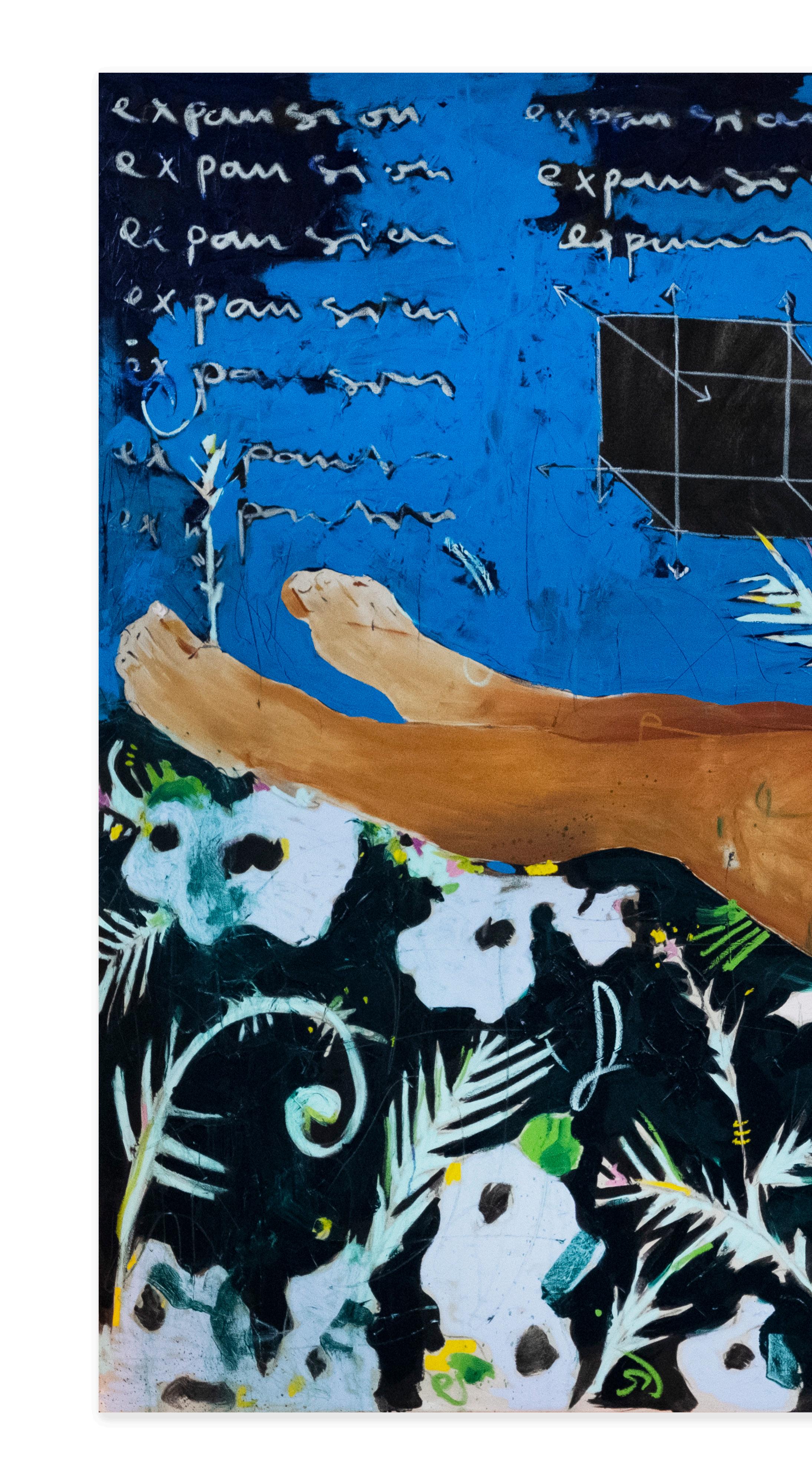 “I made this painting after my first solo exhibition in Los Angeles last fall (2021). I was exhausted and drained. I put all my emotion in this work. I had just gotten a new studio in the Bronx—the first time I had a real studio, so I had big expectations. Then nothing came. My brain was fuzzy and out of focus. Coffee didn’t help. I fasted for a few days, cut out alcohol to get deeper clarity. I was having a total artist block. It was the first time ever and I had to work through it.