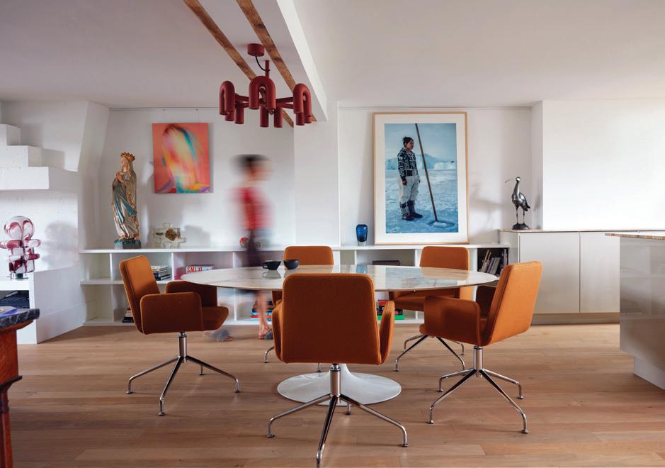 1Terracotta. Harmonie des tons dans la salle à manger avec la suspension Chandelier L par Ago Lighting et les chaises Vik chez Ligne Roset. 2Design. Pièce iconique du designer finlandais Eero Saarinen : la table ovale Tulipe en marbre Arabescato chez Knoll. 3Rafraîchissant. Au-dessus de l’espace à vivre, une mezzanine ornée de grands vitrages et de plantes qui retombent sur un fond vert amande. 4Trait d’union. Au fond, l’escalier-sculpture unit le haut et le bas en entourant la cheminée. Canapé Enki de Ligne Roset.